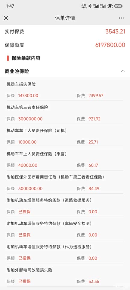 综合性价比还是非常高的,底盘用料这些也比较扎实,裸车价格是148800加上选装包5000+2000,一共是155800,加上优惠下来是147800。保险费用之前听别人说电车都很贵,我当天算出来的价格是差点四千八我感觉保险还是挺可以的,当时订车的时候店里还有送华为平板,性价比方面是满意的