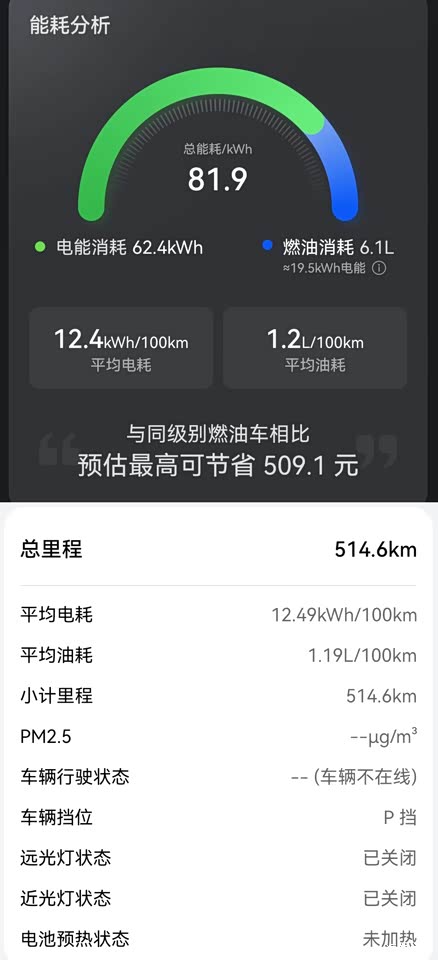 ①电耗我觉得挺低的,这是两驱增程版的车型,纯电可以续航190公里(WLTC)。②日常驾驶,我选择默认的车裂只能选择用油还是用电:开了514.6km,平均电耗12.49kWh/100km,平均油耗1.19L/100km③我M5两驱智驾增程版,满油满电续航1440公里,日常我就加200元95号汽油,大概可以增加续航450公里。④增程式车辆,完全没有里程焦虑。邮箱里面的油,只是备用的,千万不要多加。