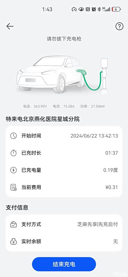 ①目前冲过三次电,充电功率在24-27kW,充电电流在70-76A,充电电压350-380V左右。②临近充电结束,充电功率会自动下降,以保护电池。