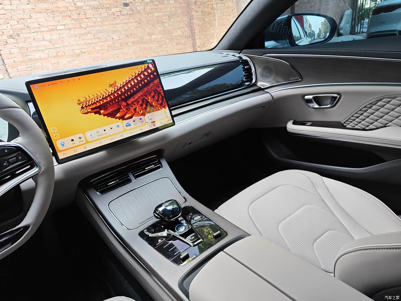 环抱式座舱设计,全新藕韵灰内饰配色,极具东方韵味的龙鳞纹皮革缝线纹路,营造出独树一帜的豪华观感和触感。15.6英寸悬浮式可旋转中控大屏、Nappa真皮豪华座椅、HiFi级定制12扬声器丹拿音响、后排多媒体控制、前后排座椅加热/通风、车载空气净化器等全配置,可以说是将科技与舒适融为一体的豪华旗舰座舱。