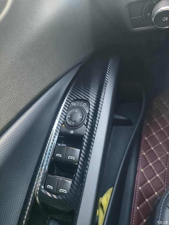 内饰方面感觉性价比很高了,七万多的小车用皮座椅,座椅舒适度包裹性也非常好,不错,内饰板中控操作区域跟车窗操作区域采用黑色亮面颜色非常不耐脏,容易留手印跟灰尘,我从淘宝买的碳纤维粘贴的,效果还是不错的