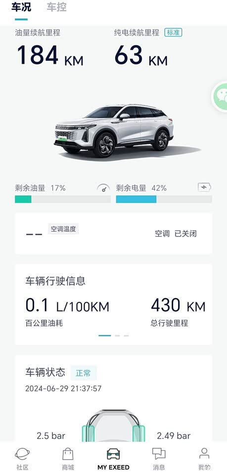 目前跑了430公里,主要是用的混动模式,前天充满了电,这几天全部是纯电在跑