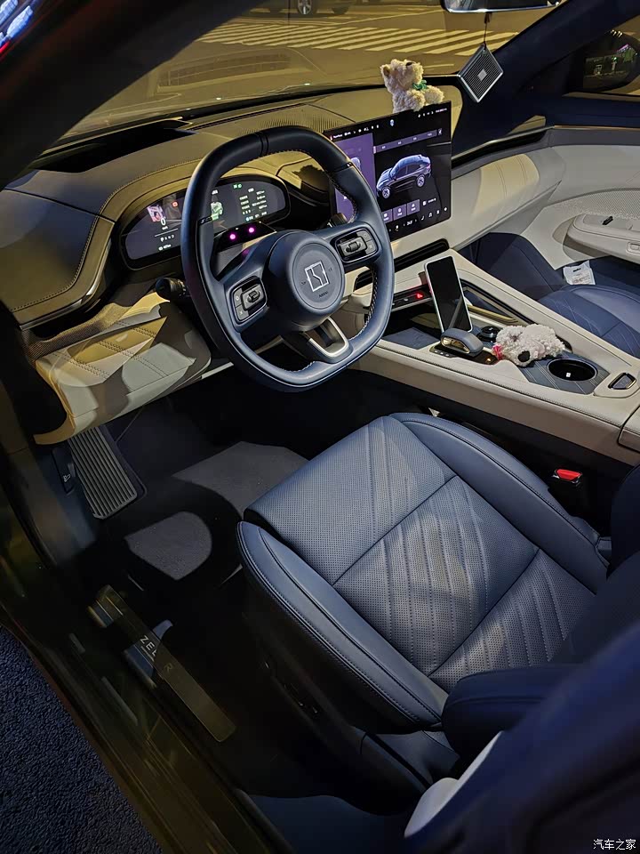 这个价位的汽车我还关注了小米su7和蔚来et5,整体来说,极氪的内饰用料更下本,触手可及的地方几乎都是真皮包裹,绒面的天花板原来只在宝马7系见过。氛围灯给我的感觉很舒服,高级感up up!整个内饰非常年轻时尚,蓝白的拼色设计非常亮眼吸睛,对比了灰色的内饰后,果断选择了蓝白。(没考虑黛绿的原因是担心牛仔裤褪色染色在浅色座椅上)