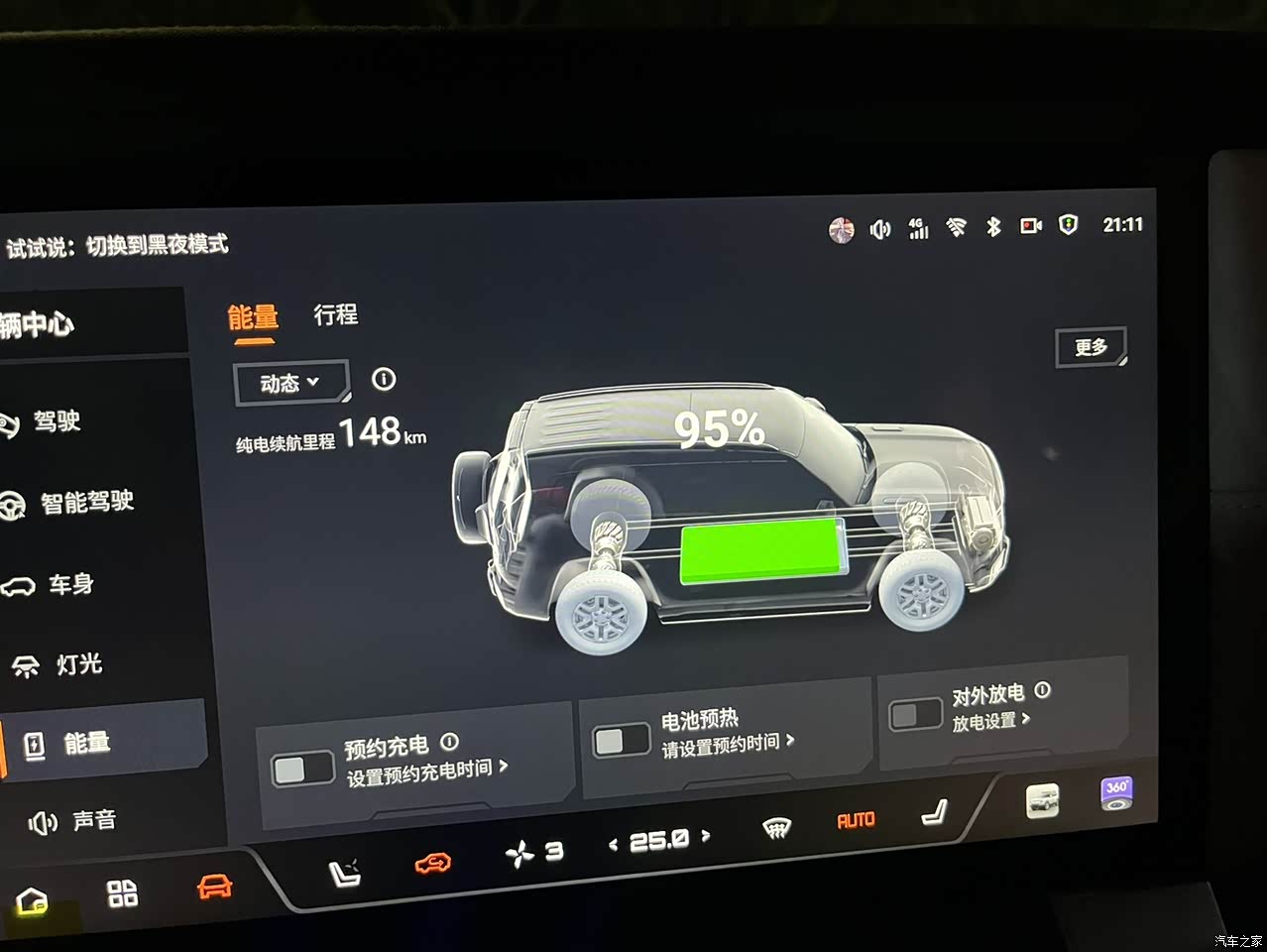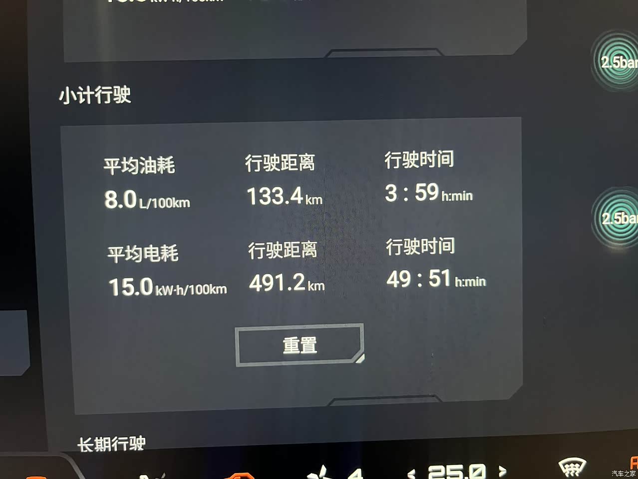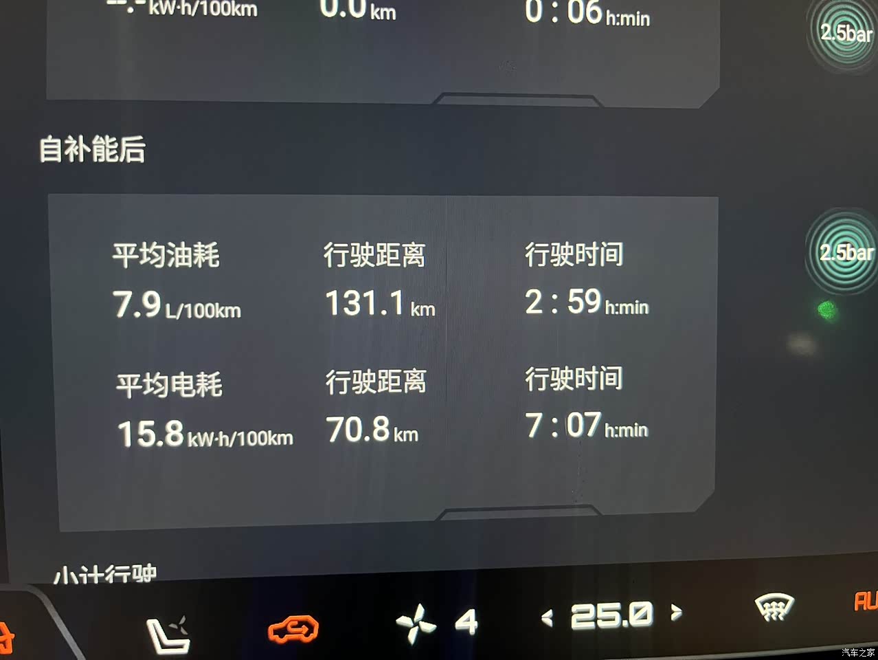 电耗整体满意: 目前是80%市区+20%高速场景,真实续航预估在150km,电耗表显是16kwh/100km(不知道什么逻辑),真实电耗预估23kwh/100km,这个电耗我是满意的,油耗8L/100km,高速多是纯电场景,这个油耗仅做参考。 备注:我满意主要是对比以前开的合资大SUV的油耗,那个要12L/100km,而且比G318轻500kg。