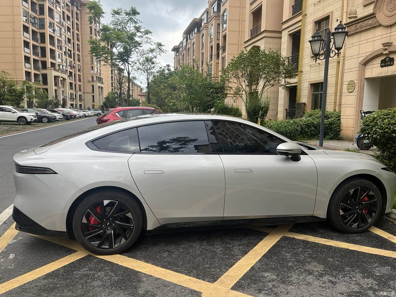 他的外观是我最喜欢的地方,他整体车身是无比五的设计,然后是一个大遛背,使用的是无框车门,然后再配上选配的19寸的轮胎和红色卡钳加尾翼,这外观无敌