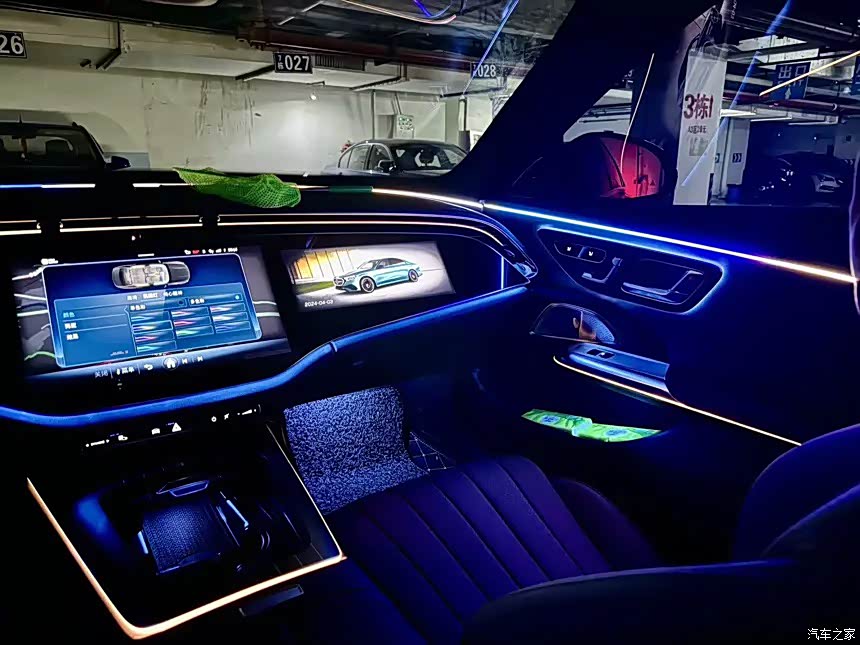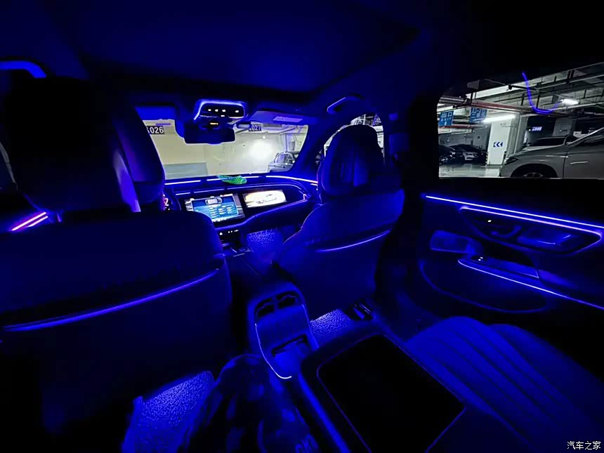 内饰用料只能说一般,座椅都是仿皮的,只有方向盘是真皮的,但是64色环绕式氛围灯的加持下,夜晚就像移动的KTV。独特的三联屏设计也将整车的科技感拉的满满。