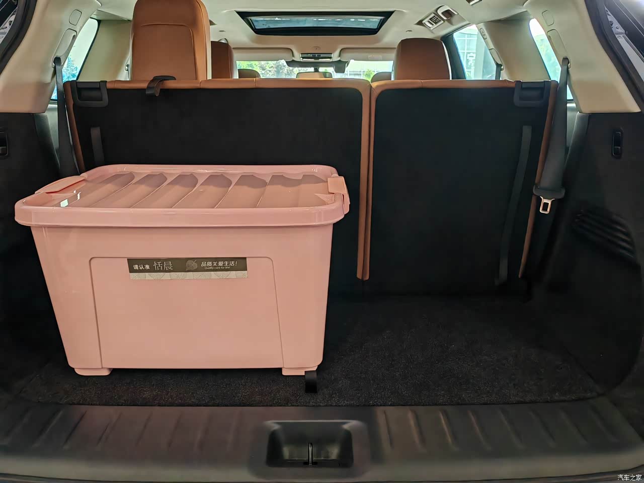 这是第三排没有放倒的情况下,哇,放着大的收纳箱,感觉空间还很大吧,放倒第三排,就可以想象还有很大了。