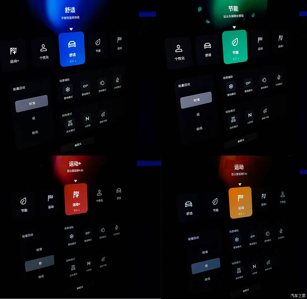 EP模式:速度快的让你头晕难受,谨慎使用,谨慎使用,谨慎使用,运动 模式:推背感十足,可以说见谁秒谁。(空旷路段用过几次,平时不敢用)运动模式:没有运动 那么激进,不过也能让你心潮澎湃。舒适模式:有点老司机感觉,电门加速平稳。节能模式:比老司机还稳定超级节能模式:没用过还是习惯用舒适和节能模式,加速平稳,动能回收标准使用久了还蛮好用的增加续航。
