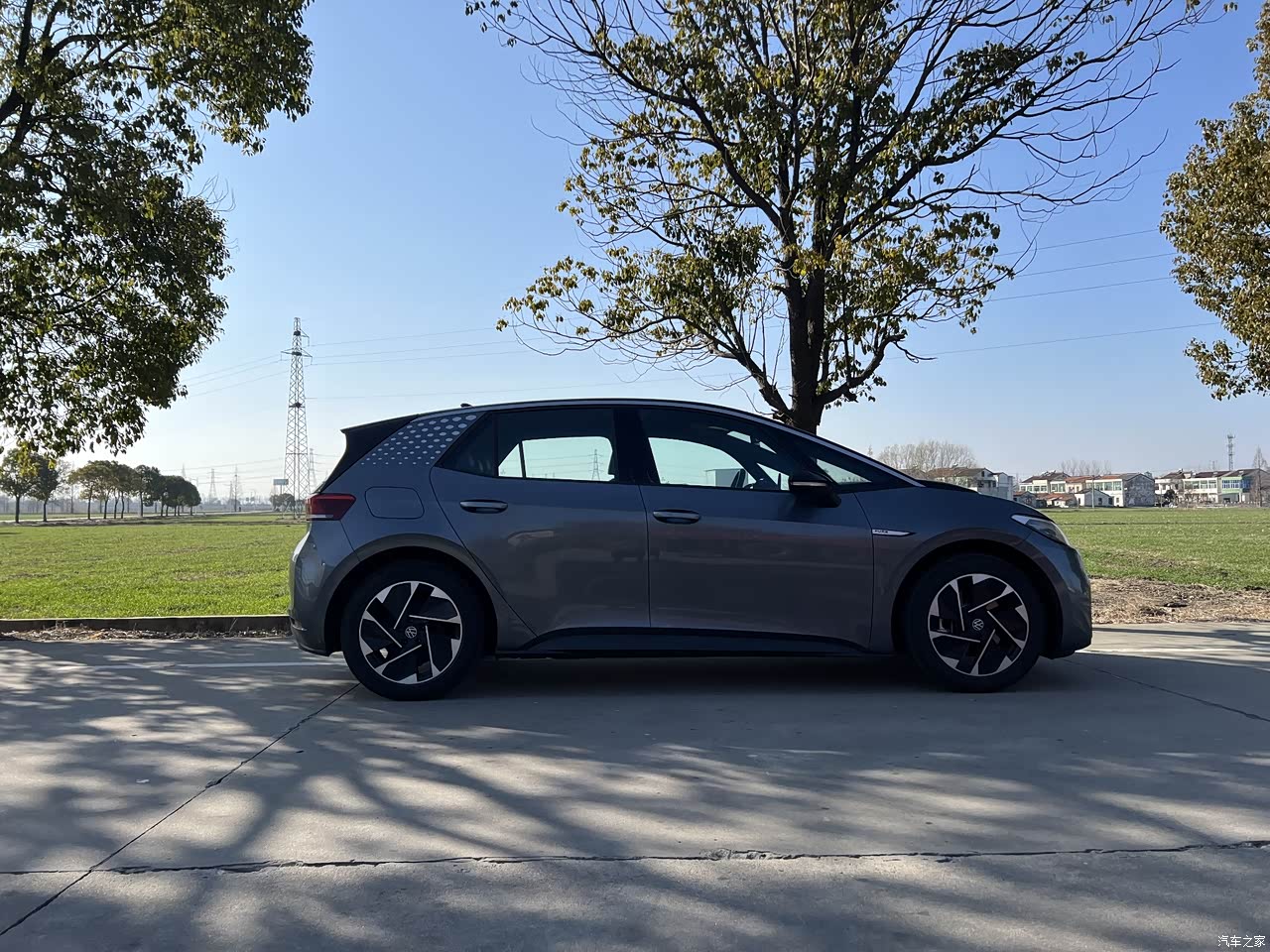 关于颜色的选择,当时基本上主推白色灰色,提车的速度也会快一些,白色算是ID.3的最佳配色,整体看起来更加协调大气。而我希望颜色稍微小众些,选了离子灰。 关于外观的评价,这一点可能比较主观,但我觉得应该能代表大多数人的观点,虽然不是所有人。大灯炯炯有神,尾灯端庄大方。整车圆润,有一点萌,线条过度平滑,很有设计感。前后LOGO扁平化,符合现代审美。后侧45度板正,最帅的角度之一。 买车前都是在店里看到离子灰ID.3的时候多,ID.3开回来之后发现,晚上的离子灰更好看,能够反射出夜间光影。 侧颜,18寸的轮毂非常提气,个人觉得比20寸来的更好看。 因为预算问题,没上顶配,要不然IQ.Light那个矩阵大灯还是非常灵性的,还有我觉得很实用的随动转向功能。