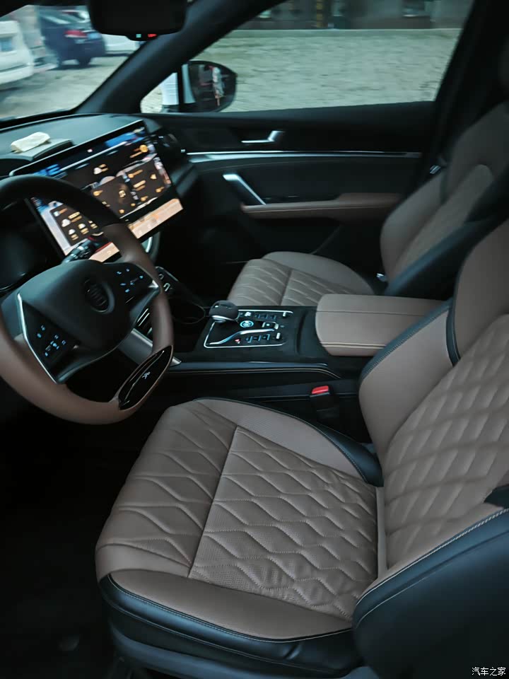 相信大家看图片也能看出来,我的车内饰和别的车不一样,哈哈没错,我把中控屏改了,我把旋转屏改成的万向轴的,倒不是说我对屏幕啥的不满意,只是单纯的觉得改成万向轴对主驾副驾都方便一些,特别是有时候在开车的时候,中控屏反光看不太清,不太好操作,现在做成这种,需要的时候往左一掰,很轻松也很方便,副驾要使用的时候也可以掰过去操作;我选的是冠军版209800的标配车型,内饰只有棕色这一种,不过棕色会显得沉稳大气一点,我倒也挺喜欢的(主要是没法换啊)。
