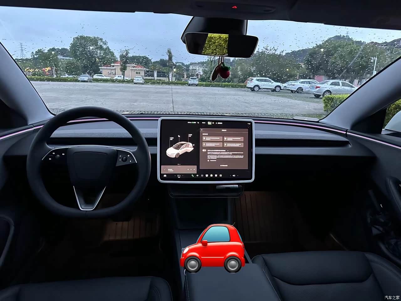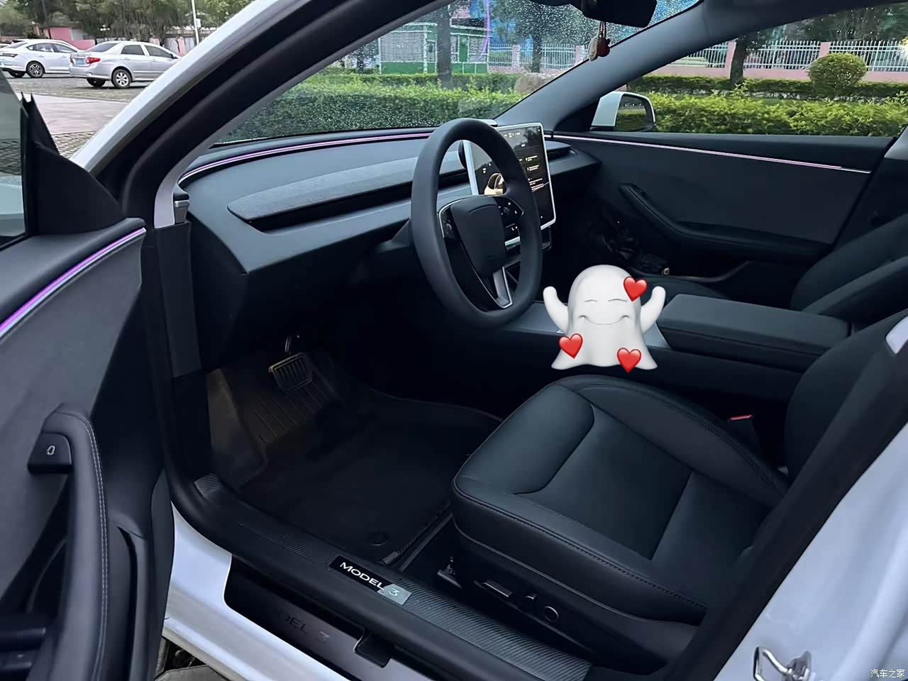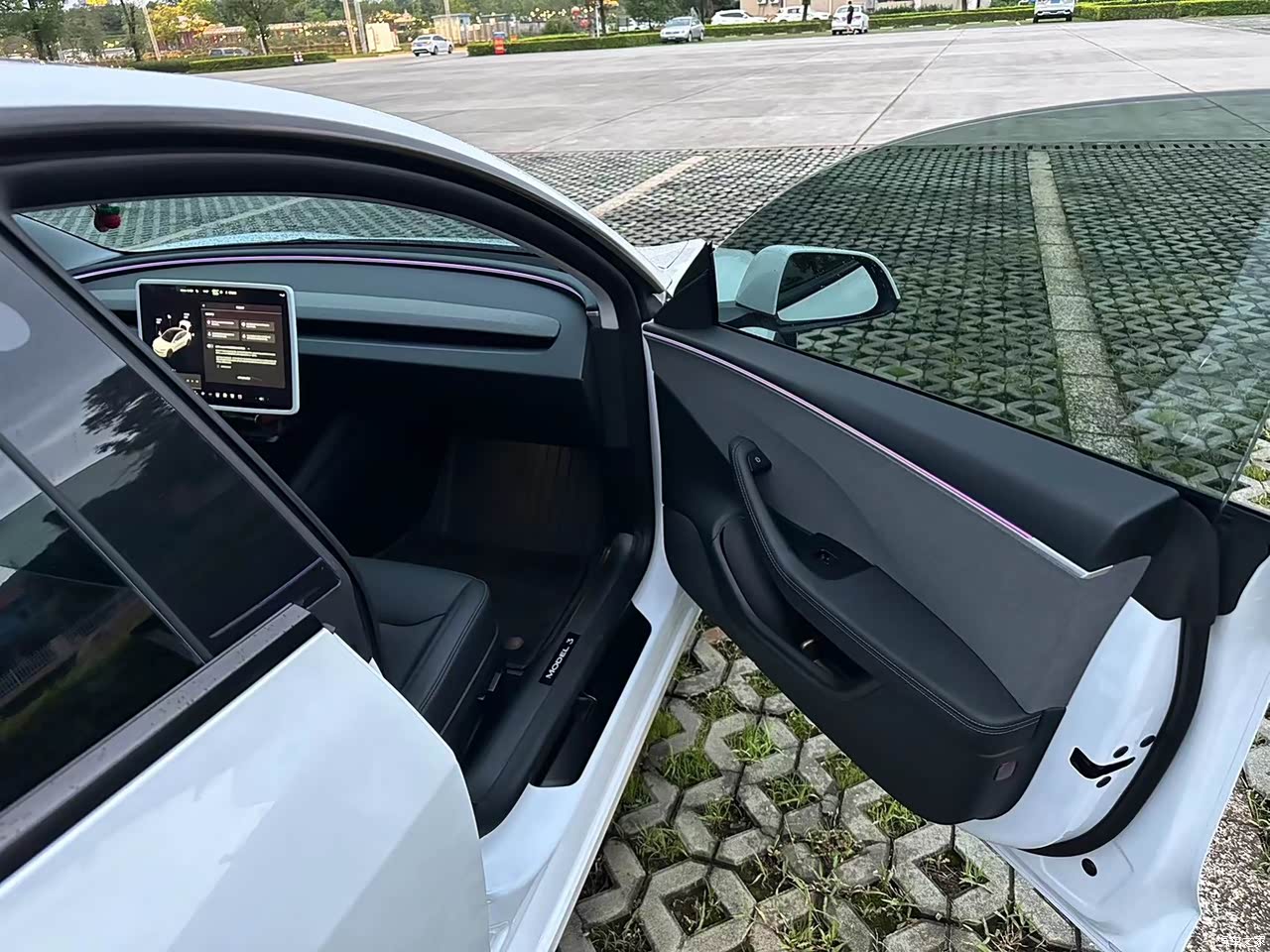 特斯拉展现了极简主义风格。中控台上只有一块大尺寸触摸屏,集成了非常多的功能控制,操作非常直观和方便。座椅的舒适性和支撑性都非常好,前排座椅带有电动调节和加热、通风功能。前后排门槛条自己买了碳纤维纹路的装饰。屏幕套了白色保护胶条。