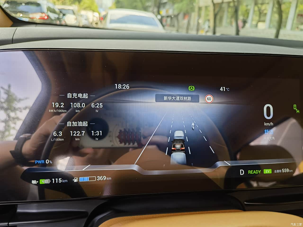目前开了一千多公里,其中用油大概一百多公里,其余都是纯电行驶。成都7月的天气30度左右,偶尔开空调23度一二挡风速,市区内日常通勤用纯电可续航约200公里左右。若纯电跑高速,100左右定速巡航,不太精确统计大约续航150公里左右吧。暂时没有用燃油模式跑长途高速,无法得知纯油巡航油耗,待后期使用测试后再补充。