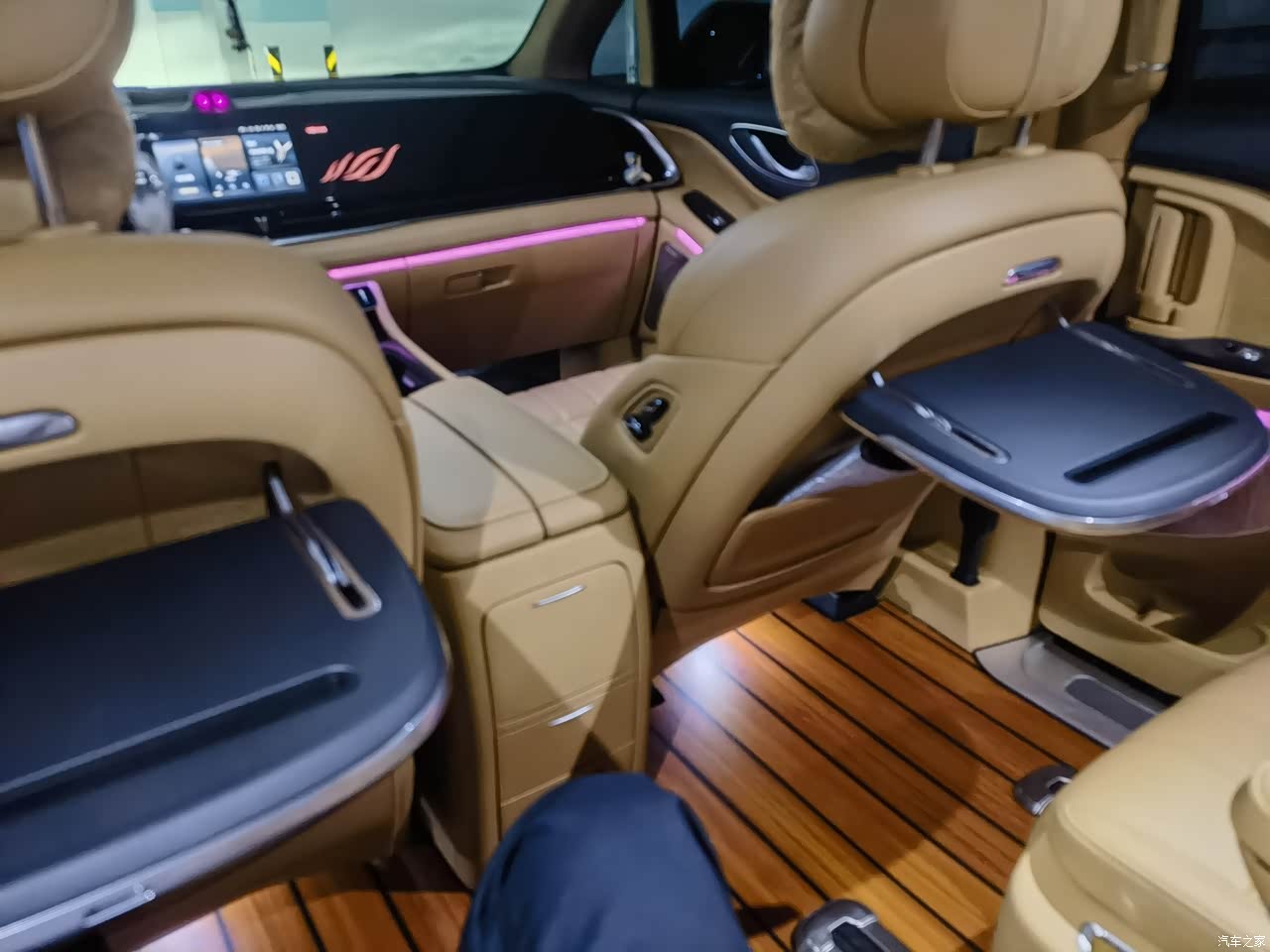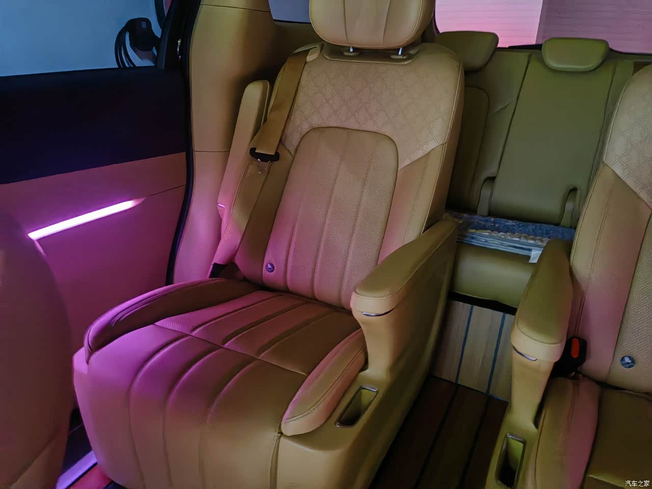 梦想家的驼棕色内饰自然烘托出非常高级的感觉。整车绝大多数地方都被皮质所包围,手摸上去的触感也十分舒服。丹拿音响盖板修饰以银色,点缀在大片的棕色皮质中,高级感更加凸显,起到了画龙点睛的作用。非要提个不足,就是内饰可选择的颜色偏少。除了驼棕色外,还有另外一种米白色。建议可定制黑色、浅蓝色、红色等,以满足不同消费者的各种审美需求。
