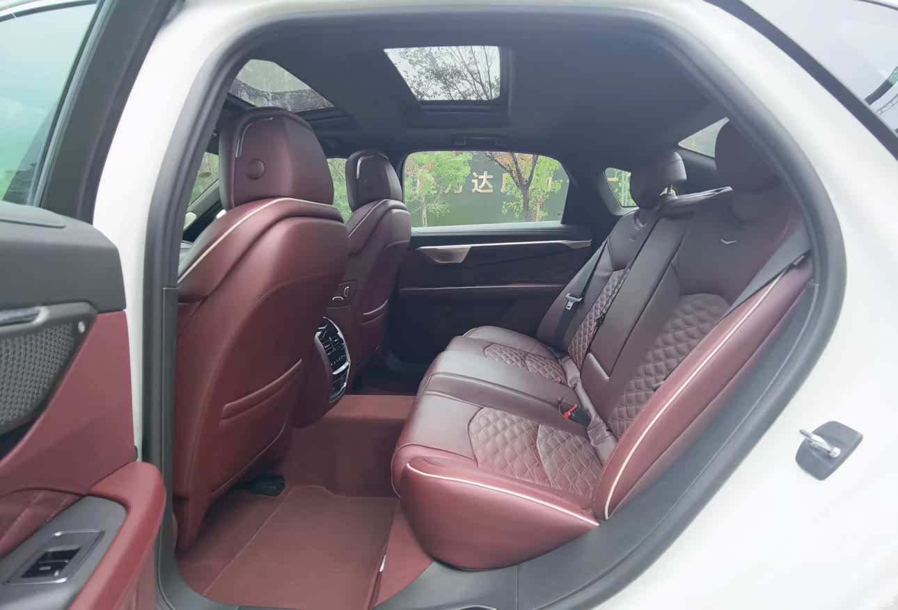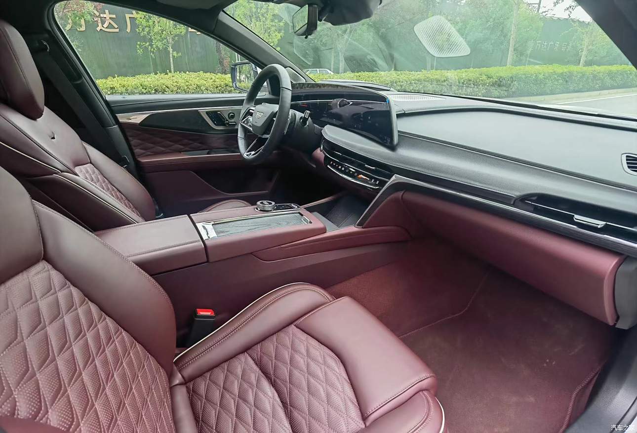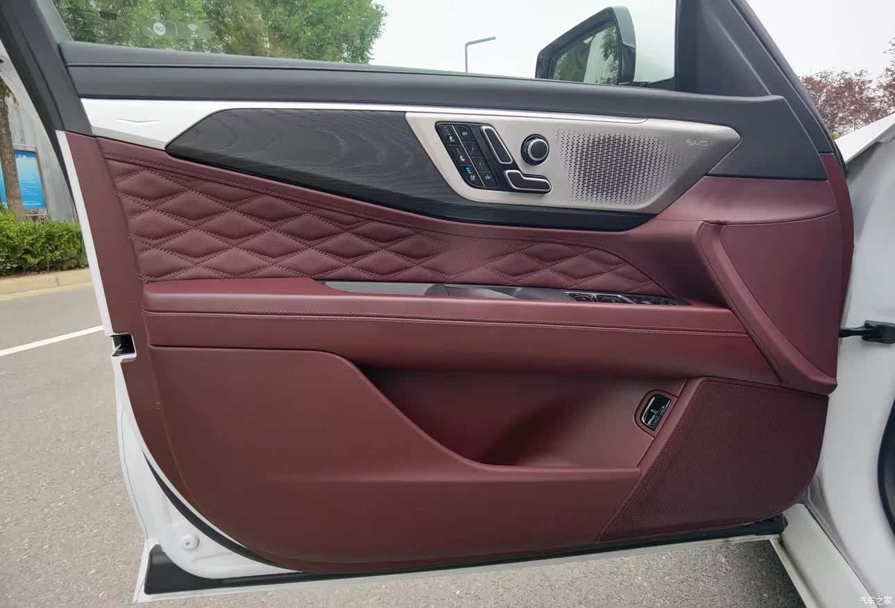 内饰豪华感十足,有一个33英寸的超大屏幕,简直太好用了,视觉大气且充满科技感。座椅、门板、中控区域都被红色的真皮材质包裹,前后排座椅都带有加热功能,前排座椅主副驾驶都有座椅记忆功能,还有加热/通风以及头枕扬声器,舒适度满分。前排也设计了无线充电区域,充电方便。分段式电动天窗,让车里看起来更加通透舒适。