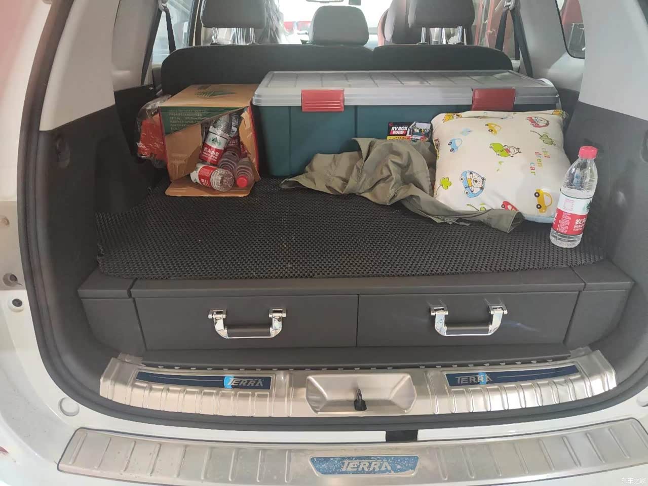 后备箱,地方也不小,我在网上看了一下,网购了一个盒子,他们叫魔盒,里边可以放东西。完了到地方可以把后排放倒,这样基本就平了,一张将近2米*1米的大床,方便休息。而且平时拉个啥大件东西也方便。