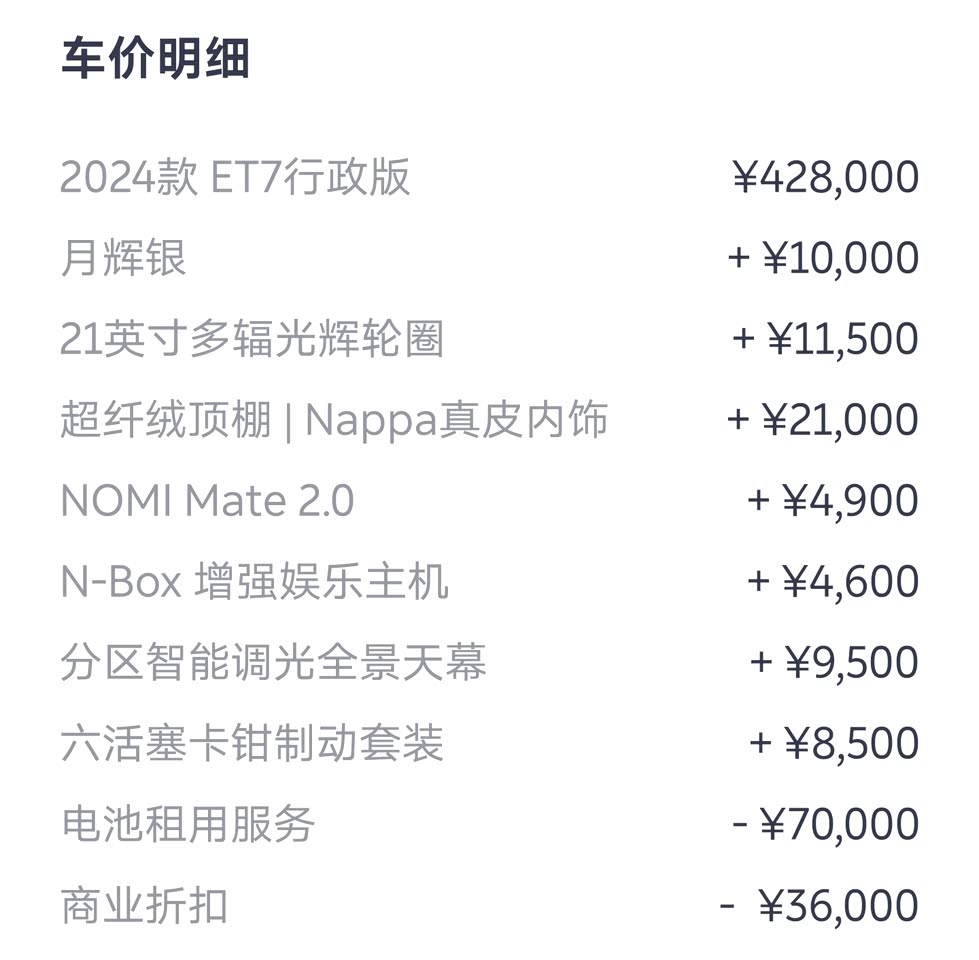 在其他车型对比方面上,我对比了宝马的i5,但是当时一点优惠没有,还要等车,就没太去关注了,同时我也考虑可极氪家的009MPV,又想了想我平常自己开啊……我又没有司机,果断就没考虑了,在燃油组我看了在东北最受大众青睐的奥迪A6L 45 四驱那款,甚至租了一辆去深度体验,就是自己有一些小个性,就必须和别人不一样,ET7正中了我的下怀,到了二次进入门店之后再试驾了一回,我就已经有点冲动定车了,就犹豫了几天,错失了预定金的30000积分,现在肠子当场就悔青了呜呜呜呜,总之吧,在这个卷飞了的时代,蔚来在新款这个用料上面会加量不加价还是很NB的。。。以上就是车主的一些真实感受嘞~看看能不能为大伙购车做一些小小的参考捏~