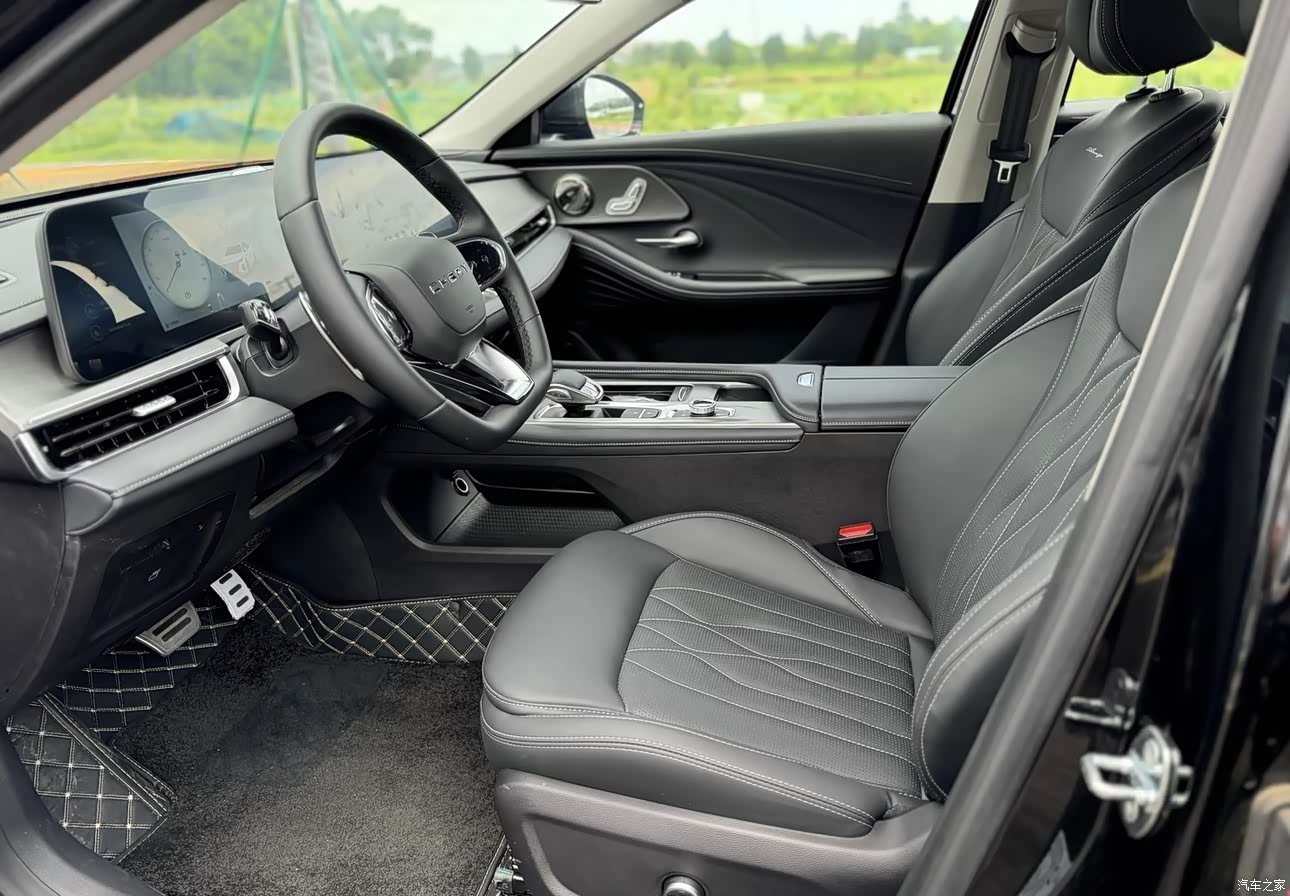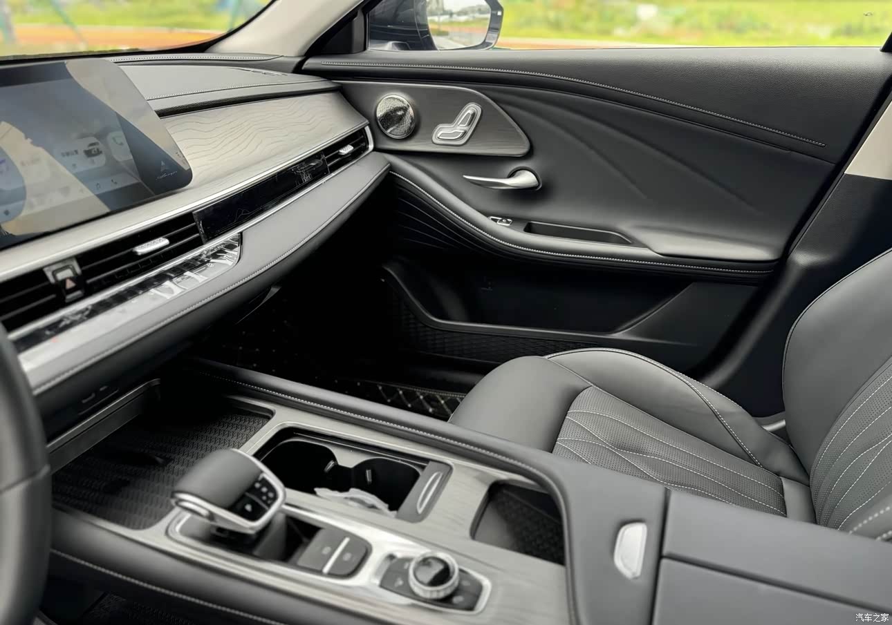 这车内饰特别挺好看,就是这个方向盘上的字母要是能换一下会更好,整体用料很好,能摸到的都是软的,比一些合资车二三十万的还要好。内饰看来看去还是黑色最大气最耐看。我比较喜欢的就是那个电动座椅的调节,是在车门上的,还有那个门把手设计的都很新颖很个性。