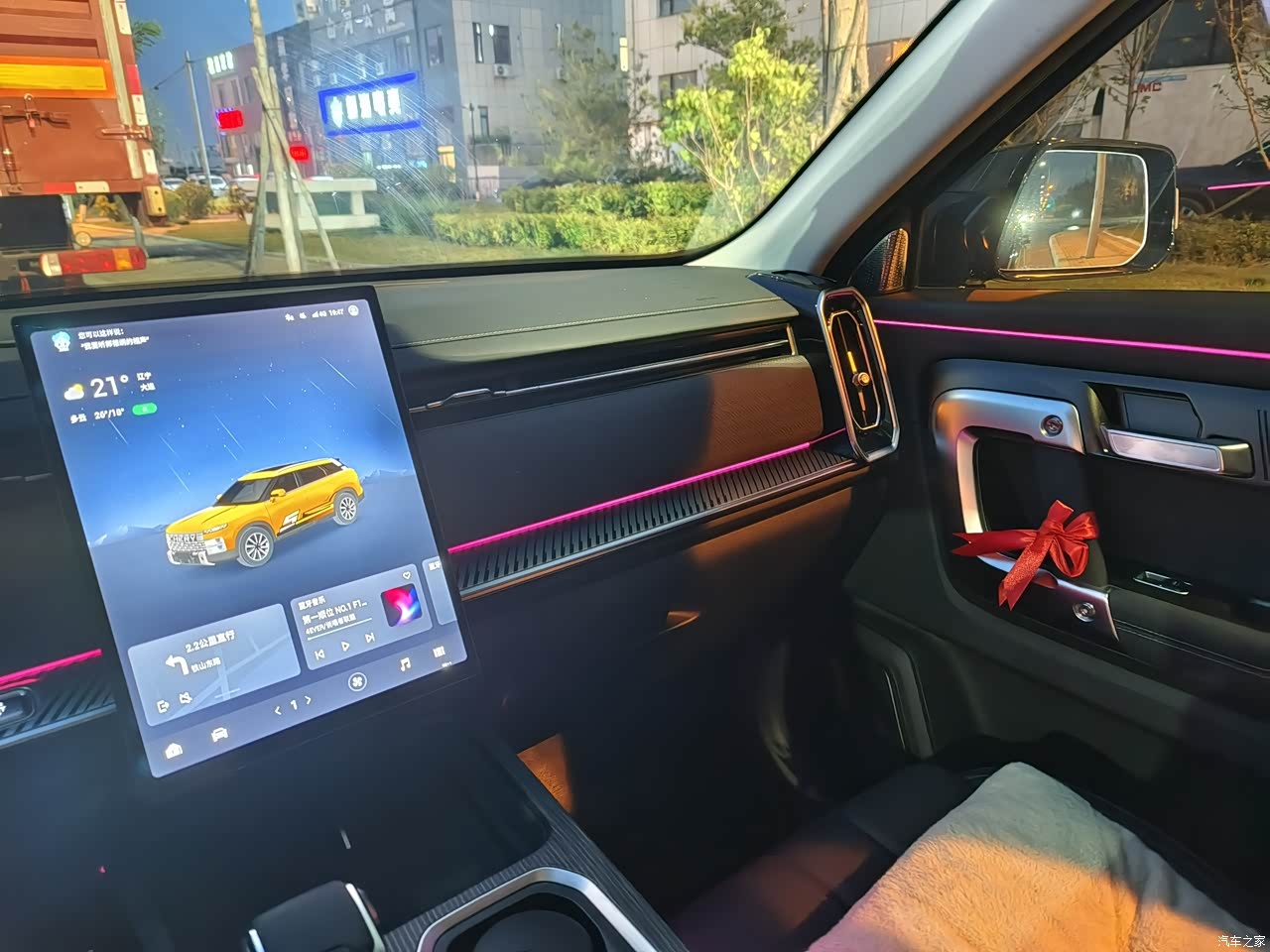 机甲风格内饰,很喜欢,人性化设计比较多,挂钩很多,后备箱可两层可一层,有隔板,旁边还有储物盒,有扶手箱冰箱很不错,多色氛围灯