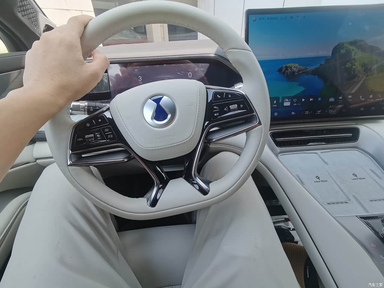 内饰设计很豪华,用料也很足。尤其是座椅的皮质摸起来很舒服,坐上去也很舒服,还有加热通风按摩的功能,坐在车里感觉舒服,包括车内还有128色的氛围灯,如果是在晚上打开的话肯定很有氛围感。我的内饰是萤石米,更能清楚地感受到用料的奢华,缺点可能就是不耐脏。