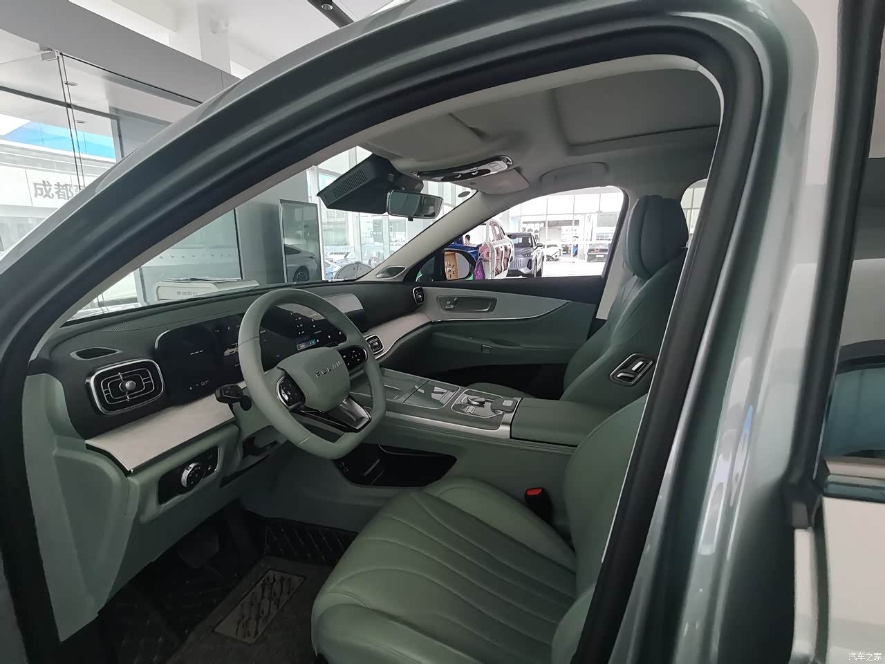 我看的是浅绿色内饰款,一眼看去感觉清馨典雅,豪华科技。细看门上、中控前台多处采用皮质材质和钢琴烤漆高级木纹面板,以及大面积浅绿色真皮覆盖,那种绿是种高级清新的绿配上浅灰色木纹的装饰板宛如豪华高雅的交响曲交相辉映。所有座椅都带有真打孔舒适透气,缝线整齐考究,座椅舒适柔软。前排座椅带有大大的腰托,坐上去,对腰部是满满的包覆感,对长途驾驶起到了很好的支撑作用,副驾为同级罕有的女王座椅,支持躺倒,配上座椅通风按摩,高级spa随处可享。前排座椅头枕配备同级含有的有高级音响,简直是音乐重度患者的福音。二排座椅宽大柔软,坐下三个标准成年人也不是很拥挤,二排B柱上还有空调出风口。行驶过程中隔音效果达到同级中上水准。空调风量大、降温效果明显、空调声音感觉与同级优秀产品相当。