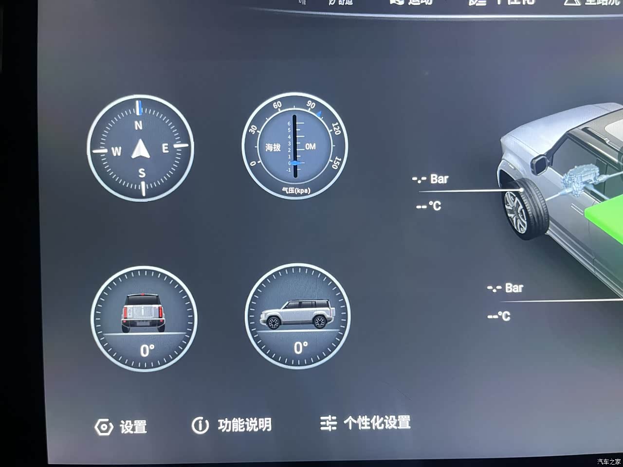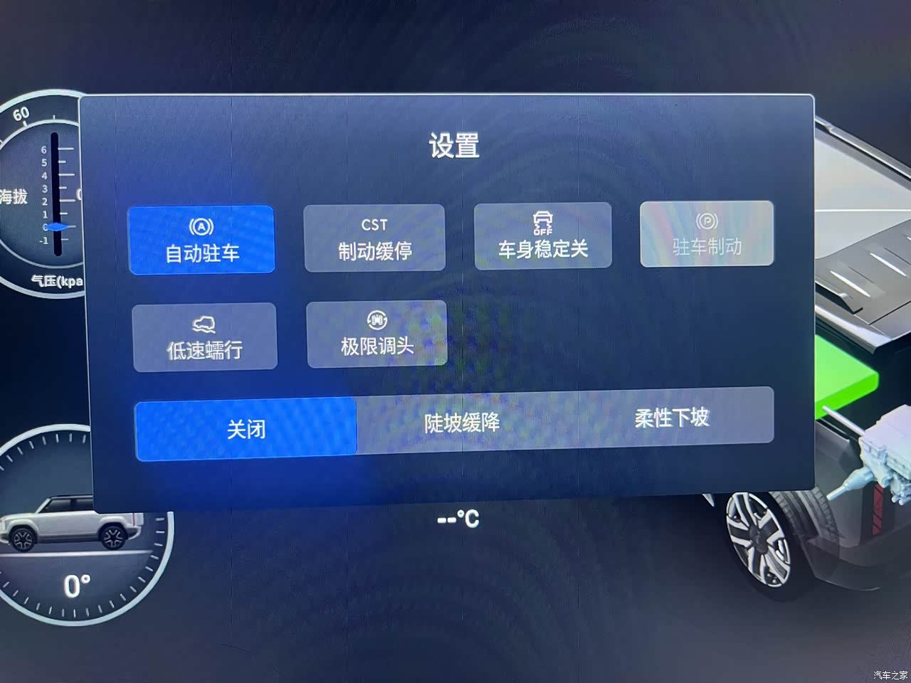 我选的是四驱乞丐版,那些智驾对我来说一点用都没有,车道辅助、主动刹车、自动驾驶什么的,不关掉也开不了山路。唯一能用的就是定速巡航。我只看重越野性能。图中的功能才是我喜欢的:有低速蠕行、极限掉头、陡坡缓降、海拔、坡度、倾斜角度。指南针我感觉没什么用,能换成气压就好了。