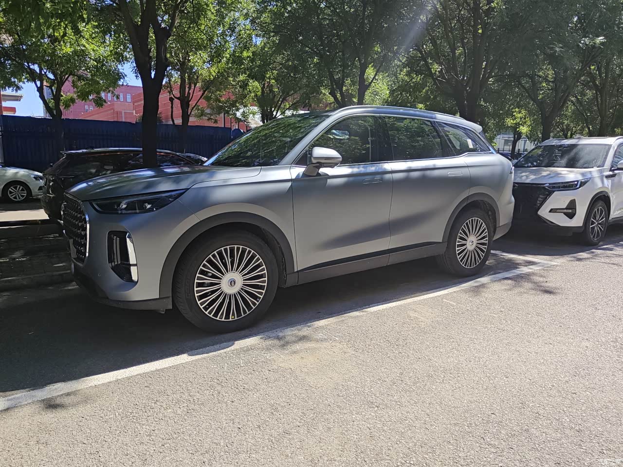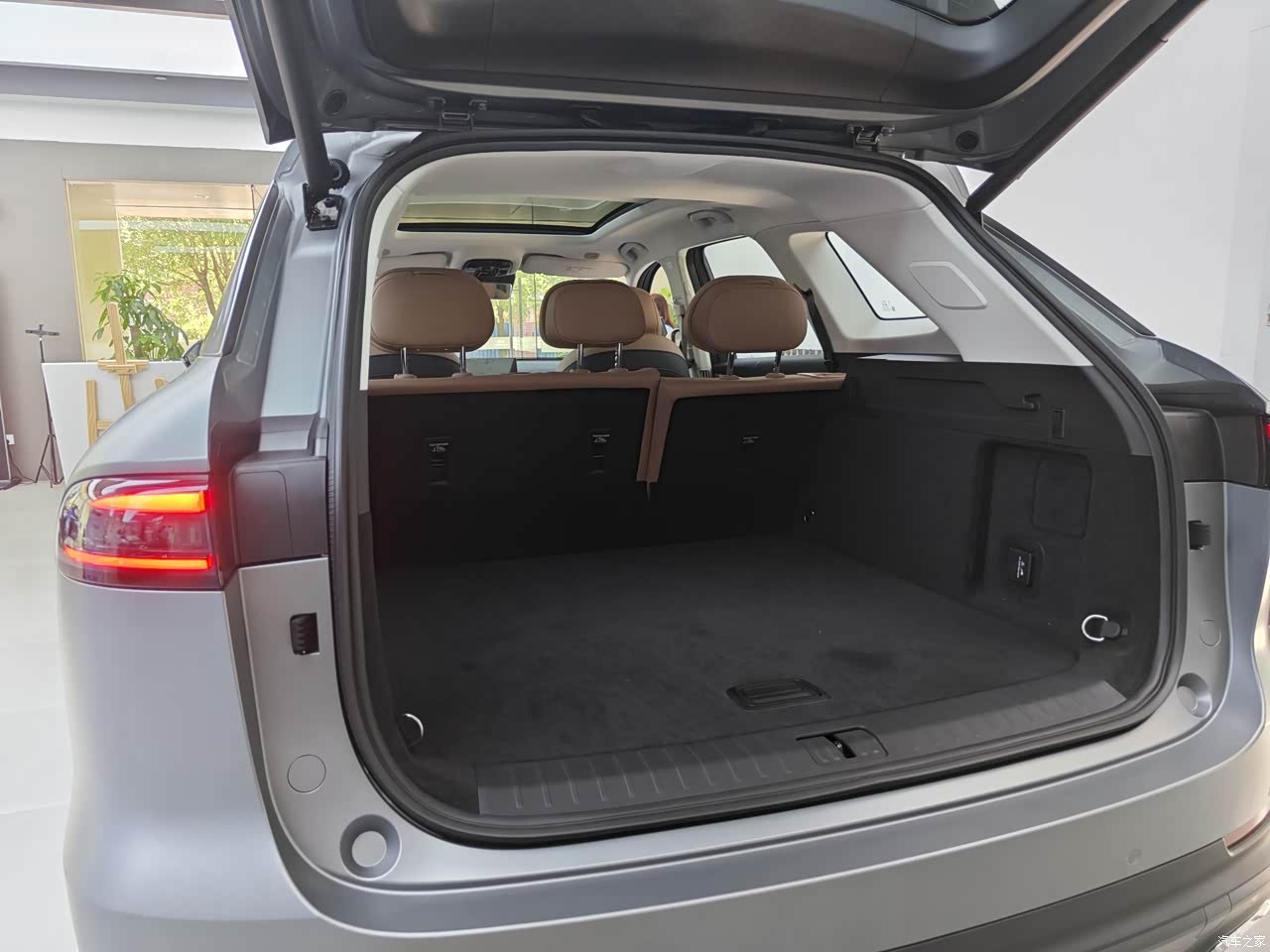这款车外观4795x1930x1729/1741,看似与绝大多数中型SUV外观尺寸差别不大,而设计语言的独特,让整车的视觉感很有气势感和膨胀感,前脸多边形的大尺寸格栅,内部采用是星点状的纹理的式样,蛮有冲击力;车灯部分是上下分体式的结构,上方是一个目前比较主流的全LED的光源,下方是回形纹LED的日行灯的光源,更喜欢车的后尾灯,凸显精致文雅;与车身融为一体的隐藏式行李架,满足长途出行载物空间的扩充; 20寸的轮毂与车颇为贴合,更彰显整车的霸气;静音玻璃的配置够大方;外电动后视镜是集成转向灯,里面包含有多个摄像头。