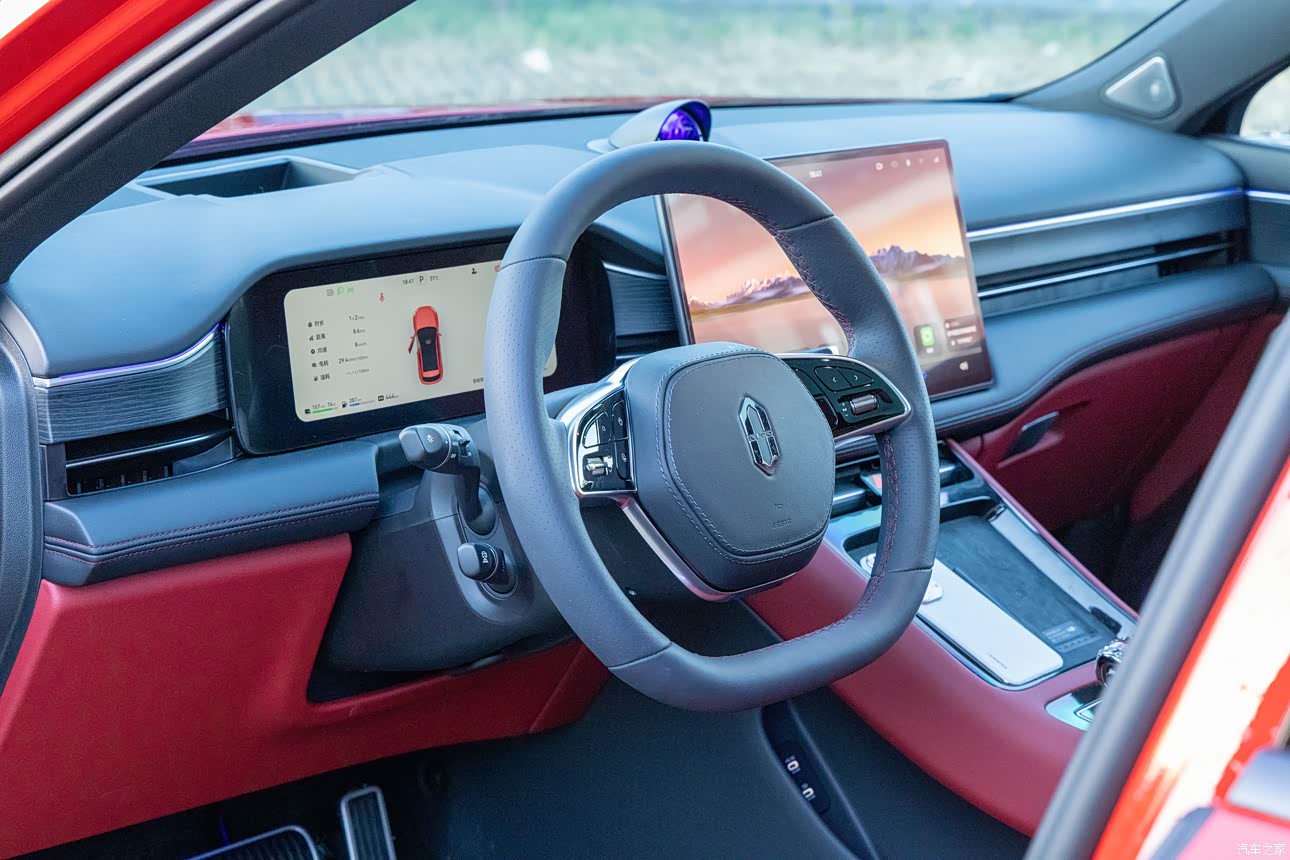 大嘴变成小嘴后问界新 M5 的颜值提升很多,我选的增程 RS 版的大都会红,黑红搭配简约时尚,没有引入多余的配色和过度设计,流畅的线条配合黑化套件还有红色卡钳,视觉上也很有运动感。
