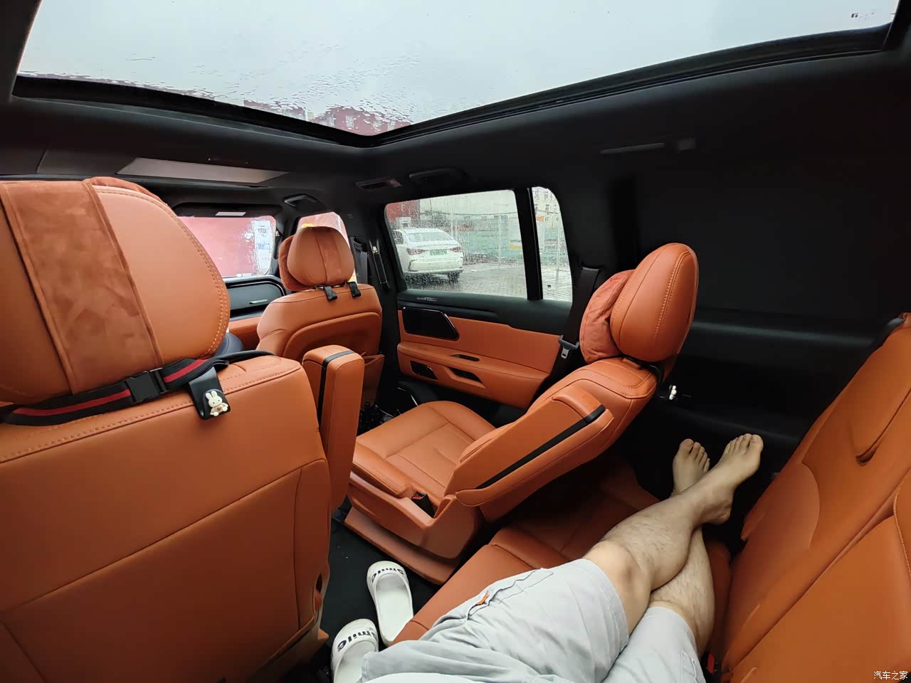 如果只是第二排坐人的话,就可以调节到特别靠后,第三排坐人的话,一排二排往前调一调,就可以所有的人都坐的特别舒服,一米七的男生腿前面差不多有一拳多,头顶的空间就不用说了,很高的