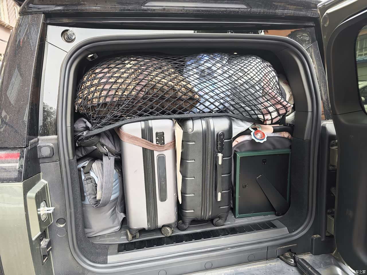 后备箱可以装挺多的物品的,如果觉得不够或者是要出去露营装很多的东西,可以把第三排的座位放到一个或者放到两个,就会装特别特别多的东西