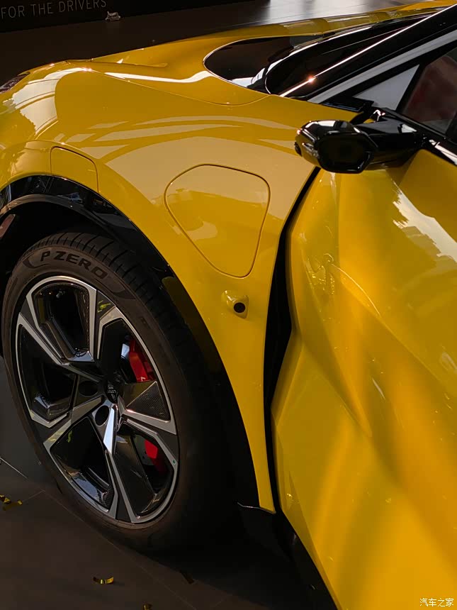 在后视镜可以看到尾翼高高升起。战斗姿态令人着迷。实车永远比图片要漂亮。选择索拉黄,正统的跑车颜色。造型满分,各角度无死角。 如果选择碳纤维外观就更到位了! SUV里可能只有价格三倍的urus能打了。