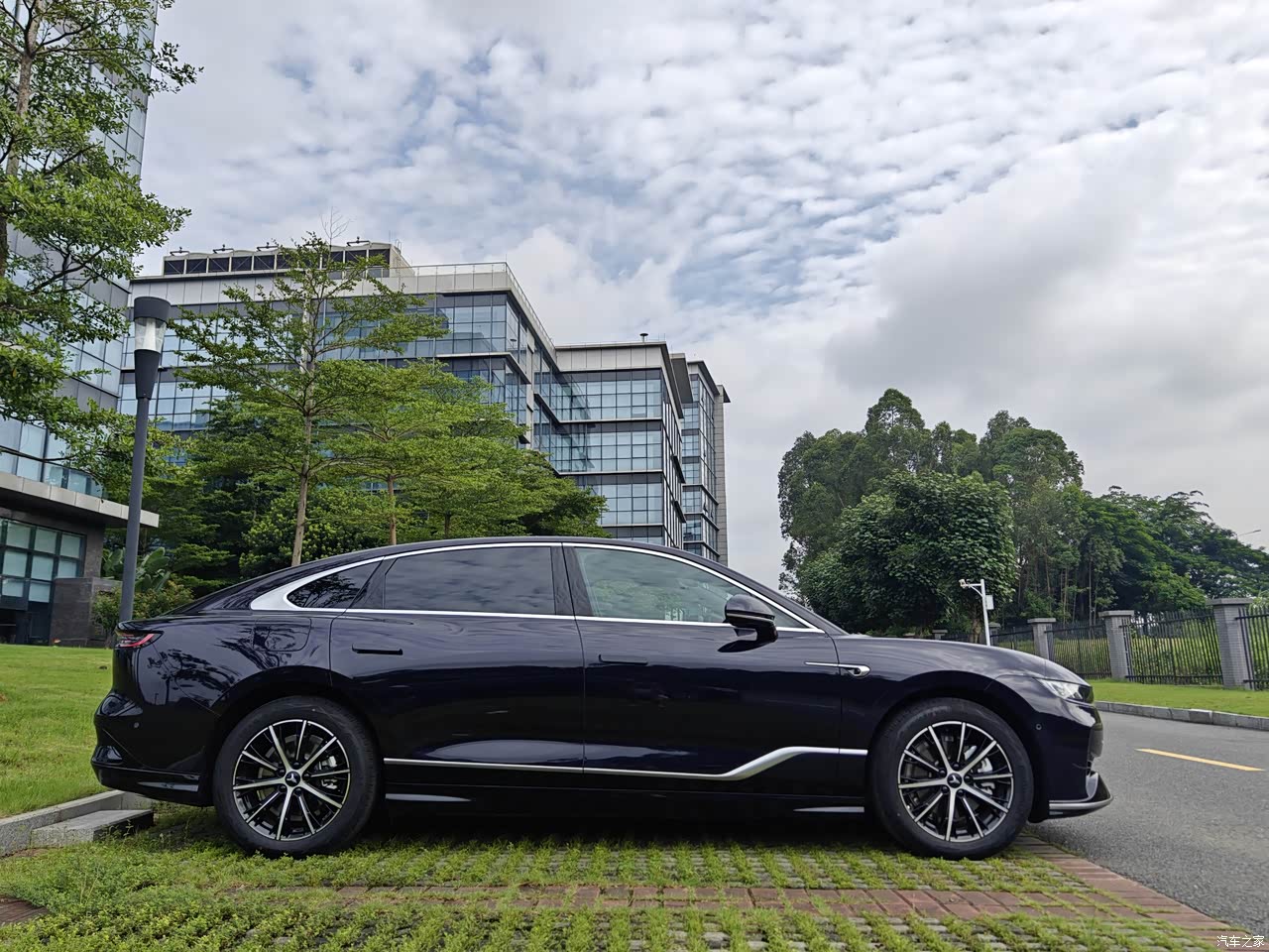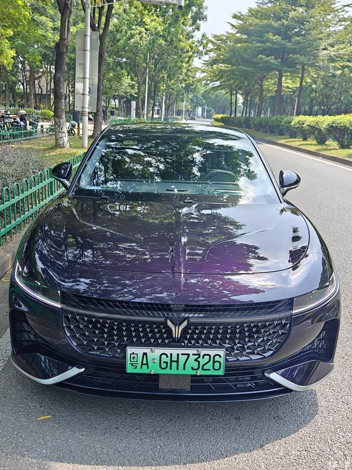 我选的颜色是旭日紫,暗光环境下看是黑色,亮光照射下是紫色。颜色很深邃。 前脸还好,挺霸气的,机舱盖还有岚图的logo。 侧面看是溜背造型,镀烙饰条有点过度设计,搞成一条银线应该好看点,比如迈腾。 现在z字形没什么气质。 整体来讲,外观见仁见智,对于我而言还是比较满意的。