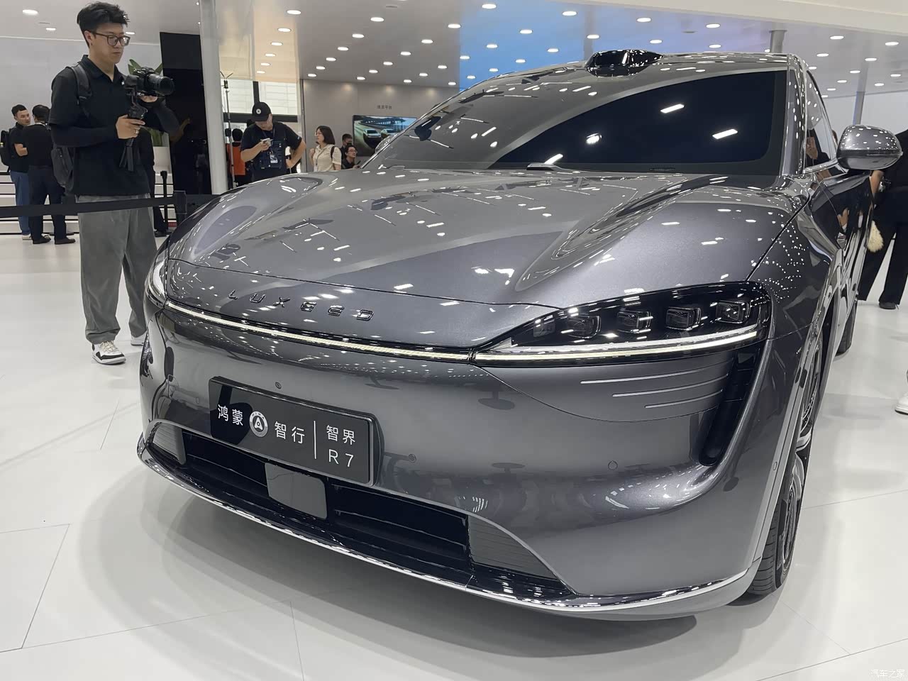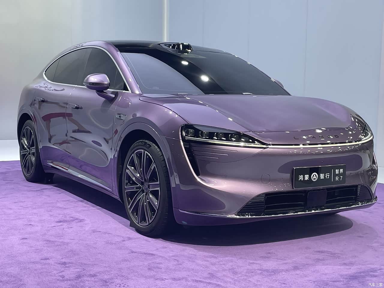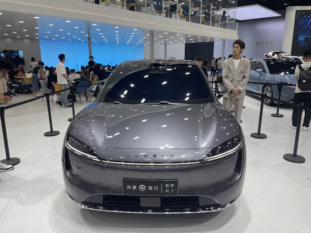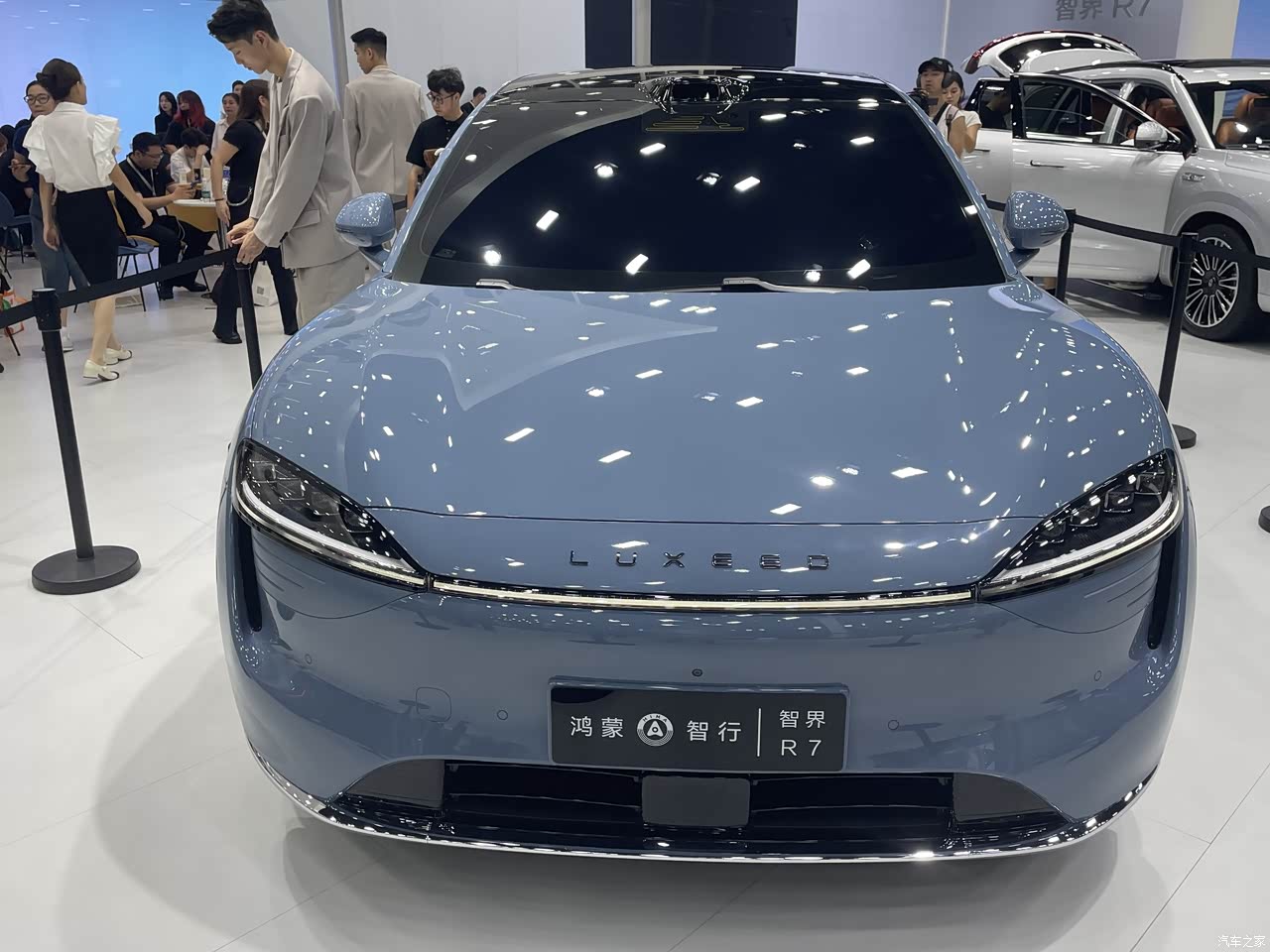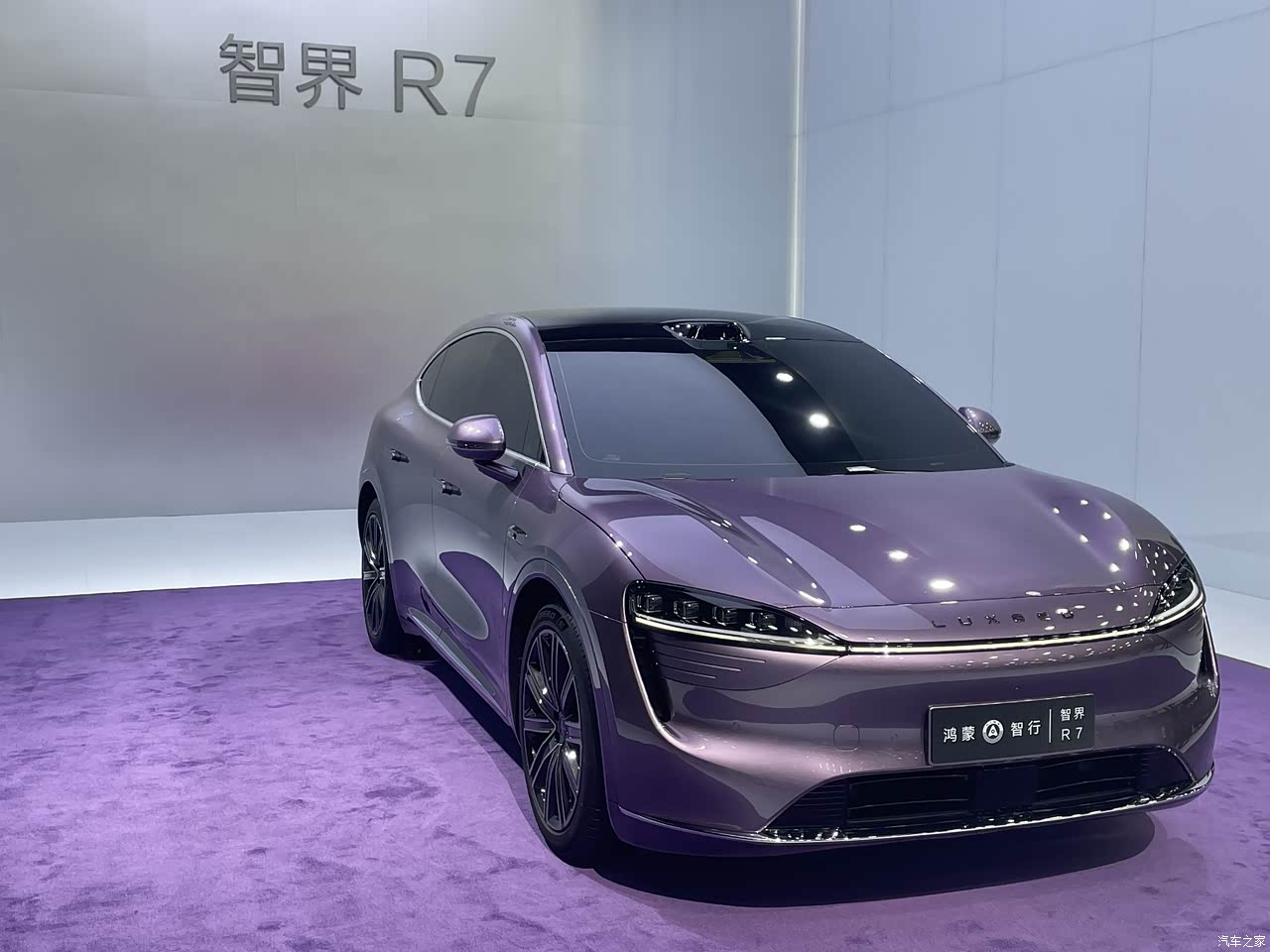 看展当天这台车一共有三台配色在展出,我个人比较喜欢的是灰色版本。 因为在现场这个灰色它有点泛银的效果,可以很清晰的把这台车的线条勾勒出来,我特别喜欢这台车引擎盖做出的隆起造型,把这台车的气场拉升不少,而且它前面的这个贯穿式led灯带我相信在夜晚的点亮效果一定非常的漂亮,但是在这个灯带的下方左右两侧都有三条凸起装饰条看着有点像猫胡子不知道这台车在上电后它会不会发光亮起来,如果没有灯光效果,我个人觉得就有点画蛇添足,其实现场这台蓝色展车正面搭配上了黑色的运动套件显得活力十足,还挺不错的。 当我来到车后方,我才发现原来智界R7的车尾部非常的饱满,我就喜欢这种敦实的造型,不仅显得车很大而且气场也很强,尾部玻璃上方的刹车高位刹车灯,视觉效果稍微有一点细,其实可以加粗一些。 这台车的侧面视觉效果我觉得也挺漂亮的,在车裙部分有一个收紧的效果使这台车的运动感更强了。 不过我个人不太喜欢现场这台紫色配色的版本,阴柔感有点太强了,看起来比较娘炮,但是这个车漆我现场看了一下里面好像有类似金粉的材质,看起来闪闪的挺有高级感的。 我看网上说这台车和特斯拉的suv有点像但我现场仔细看了后觉得这完全是两个风格取向特斯拉是完全偏向运动,这个是豪华感加运动,我个人比较喜欢智界R7这个风格。 同时我还觉得这款车的设计完全跳出了BBA的设计风格有自己的东西在里面,这种国产原创设计还是挺好的。