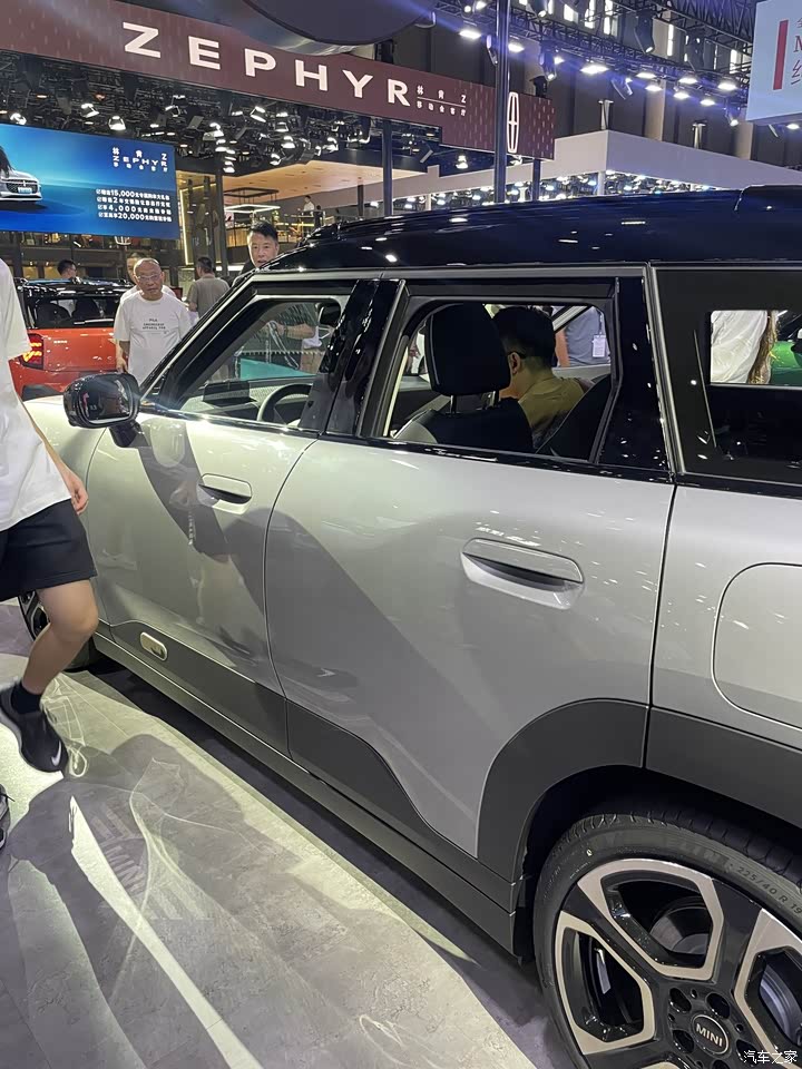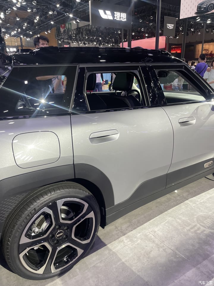我现场体验的这台车应该是艺术家版本,这台车的设计非常的漂亮,车身整体的比例延续了MINI经典的特点,特别是这个前前大灯就像一双眼睛一样对着我忽闪忽闪,想要让我把它接回家,车身的侧面加入了一些新能源汽车的元素像是隐藏的门把手,但我特别喜欢它这个车身双拼色上黑下银的配色看起来复古当中又有一些时尚。 个人觉得最对我胃口的还是它车尾的设计一眼就认出它是一台MINI汽车,但我记得以前MINI都会配米字旗样式的车尾灯,但这款车灯有点像蜘蛛网的形状,我个人不太喜欢,不知道后期能否DIY把它改过来。 另外我觉得这个悬浮式的车顶简直是画龙点睛,不知道上方是否有行李架,后期可以在上面加装一些户外用品会使它看着更酷更可爱。