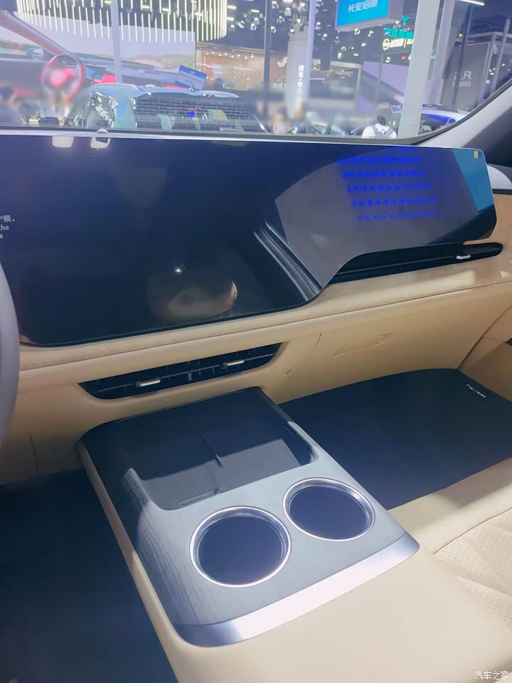 类似的设计可以用清新淡雅来形容,它整体的内饰风格是米黄色为基调搭配了一些黑色元素在里面,整体看起来干净简洁,同时在中控台方面,它有一个巨大的连屏设计,让这台车看起来很有科技感,但是现场这台展车没有启动电源所以没办法看一下它的显示效果。还有一点值得说一下它的中央扶手用了一些木质材料作为装饰,特别是像水杯架的位置,还特意做了一圈金属的装饰条,我觉得还蛮有高级感的。