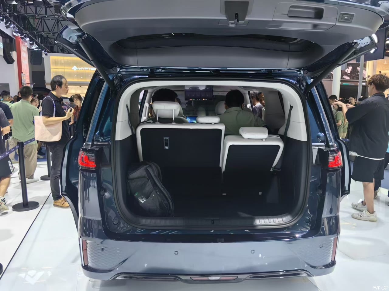 空间应该是这台车的主要卖点之一,我们体验的展车是7座车型它采用的是2+2+3的座椅布局,作为老板位的第2排,它的空间是相当的宽敞而且还留了一个中央通道,第三排的乘客也可以相对比较轻松的进去,第三排虽然是三座布局,但坐两个人可能会比较舒适,倒不是它的高度不够而是宽度稍微有些不够。 这台车的后备箱空间在第三排立起来的情况下,我觉得比GL8那种商务车要稍微大一点点。 然后这台车的储物空间还是比较丰富,像是中控台下方有镂空设计而且每排都有对应的水杯位门板也可以放一些东西。