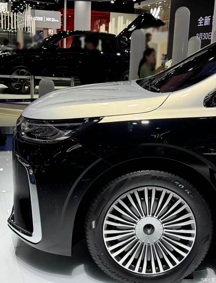 这台车的外观我真的蛮喜欢的,特别是现场这台黑白双拼配色的车型,它整车的尺寸非常的大,又在车的四周镶嵌了很多金属材质在这个黑色的底漆上面让这台车有种闪闪发光的感觉。 而且梦想家这个轮毂造型是真的漂亮超多幅的设计一闪一闪的,一下又提升了非常多的豪华感,不过我还是最喜欢他的前脸造型,用了很多镀铬装饰条作为点缀看起来有一股飞流直下的瀑布感,从视觉上降低了车身笨重的感觉起到了很好的装饰感。 看完车后,我还和朋友开玩笑说黑白配色的这台车完全可以放一个双R logo,都毫无违和感。