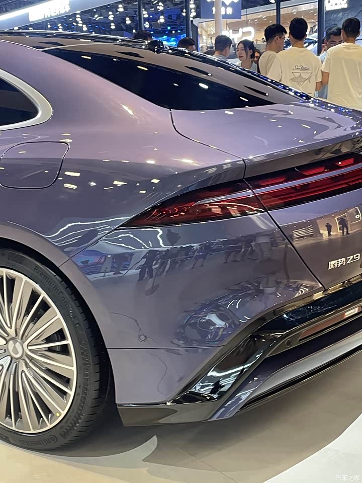 这台车外观让我最满意的地方就是它整体的线条非常的优雅,从侧面看过去就是一台非常高贵轿跑车型,而且他这个轮毂看起来非常的大气,很有运动的感觉,车头做的比较的低趴,但是这个车头大灯是非常的漂亮,它不仅大而且还修长和这个机盖融为一体让这台车的档次看起来更高级。 我看完这台车后心中有个疑惑,这台车的价格虽然只要30多40万,但是它看起来不管是长度还是宽度,感觉都比宝马5系奔驰E级那种车还要大,和保时捷的帕拉梅拉看起来差不多大,后来我朋友给我科普一下这台车的外观和保时捷有异曲同工之妙,可以说是在学习借鉴。 但我个人觉得腾势Z9的外观和保时捷还是有很多不一样的地方,比如说腾势Z9这个车尾的设计,我就觉得做的比较有个性,腾势Z9不是那种一字到底的贯穿式尾灯而是非常有个性的把灯带给分开了,中间镶嵌了一个可以发光的腾势logo,我觉得腾势Z9在夜晚的视觉效果应该比较好看。