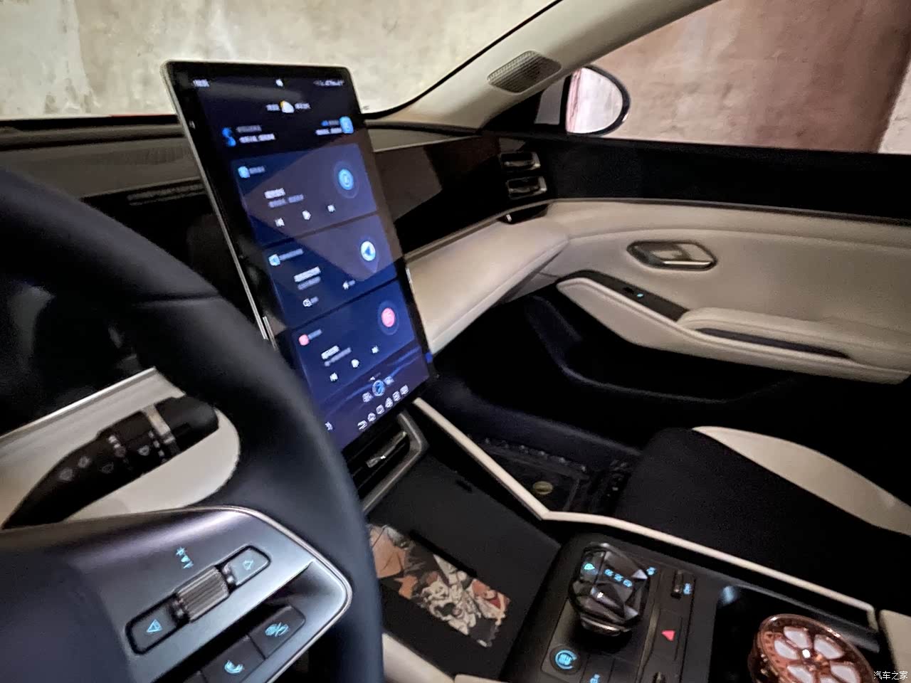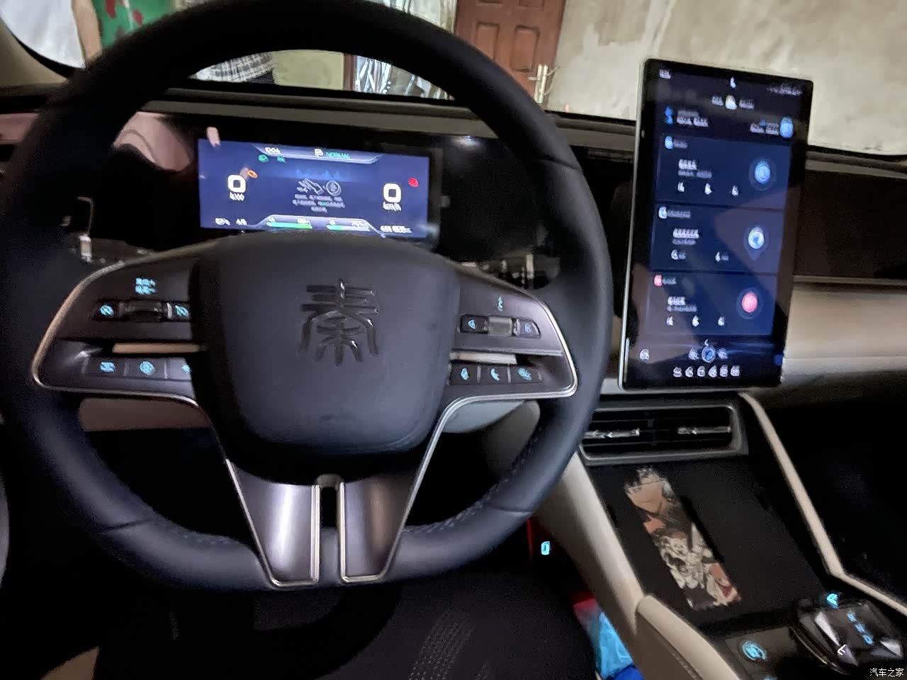 方向盘特别好看,比秦Plus的高档很多。前边这个亮色的饰板挺容易脏的,容易沾指纹。中龙上的用的是磨砂的,也挺好看,也不粘灰。挡把很好看,是那种水晶的。比较有质感。内饰我选的白色,显得很上档次,但是也确实不耐脏。