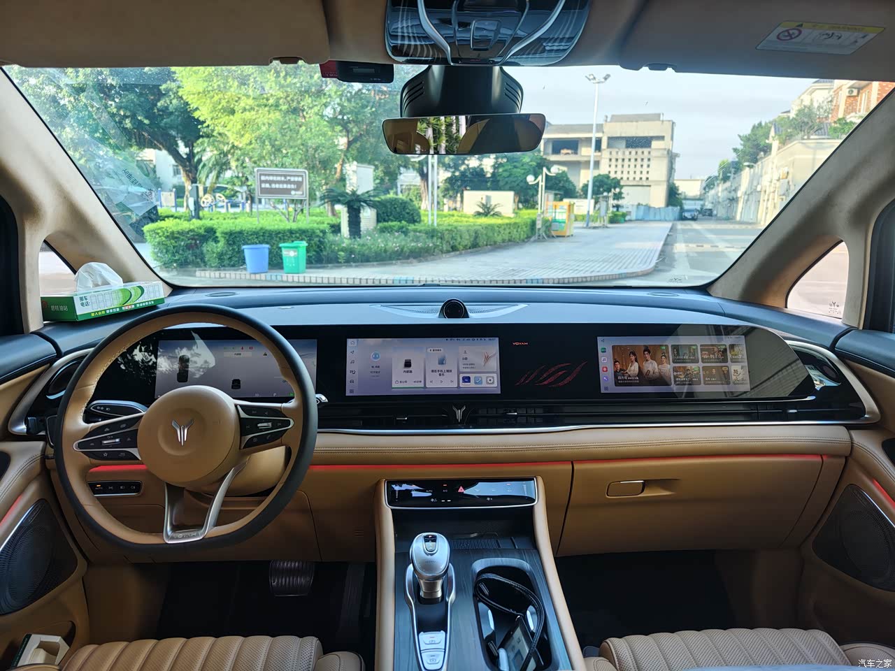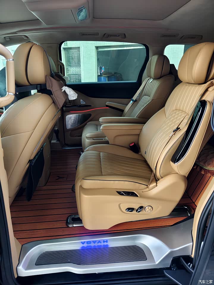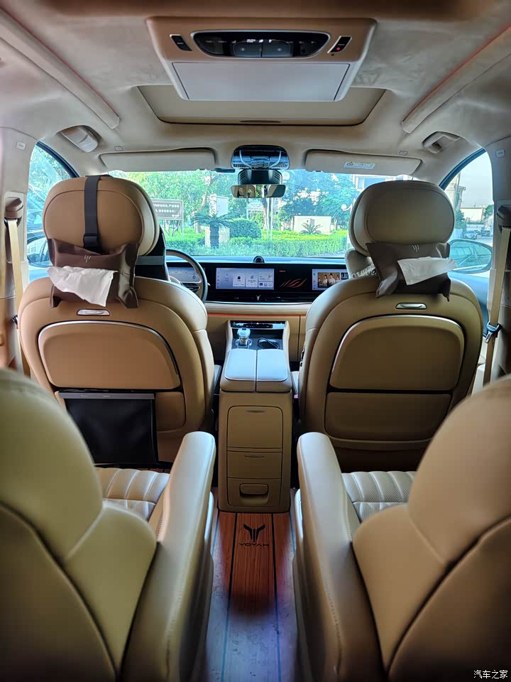 从购买岚图Free开始,就感受到了岚图对内饰材料的高标准和高要求,梦想家也维持了这个一致性,内饰的用料获得了OEKO-TEX婴儿级亲肤认证,皮质、织物都考虑着家人的乘坐健康,特别是母婴人群,打造出了母婴级生态环保座舱,作为消费者,最真实的体验就是车内没有异味。岚图梦想家的内饰采用大面积软包材质,我购买的版本还搭配了仿麂皮包裹顶棚,烤漆和镀铬饰条装饰驼棕的色调,多彩氛围灯,营造出一种高端且精致的氛围。座椅方面,前排座椅配备通风、加热以及十点式按摩功能,后排座椅同样配备了带按摩功能的通风加热座椅,座椅填充饱和度高,支撑比较到位。梦想家车内提供41个各类储物空间,包括折叠小桌、杯托等,方便存放各式物品。购车时免费升级了木地板,铝合金踏板和车顶娱乐屏幕,这些配置对于有孩子和经常需要移动办公的人群来说可以说是非常友好,小桌板除了可以放一些零食水果,小朋友偶尔赶个作业也不在话下,大朋友可以链接车机热点,随时开会、做ppt,车顶的娱乐屏幕则可以让后排乘客旅途的时光过得更加惬意。其他的舒适配置方面,可以说应有尽有,全景天窗、全自动头灯、内置ETC、丹拿音响、12.3英寸三联屏、骁龙8155芯片、无线充电、香氛系统等。