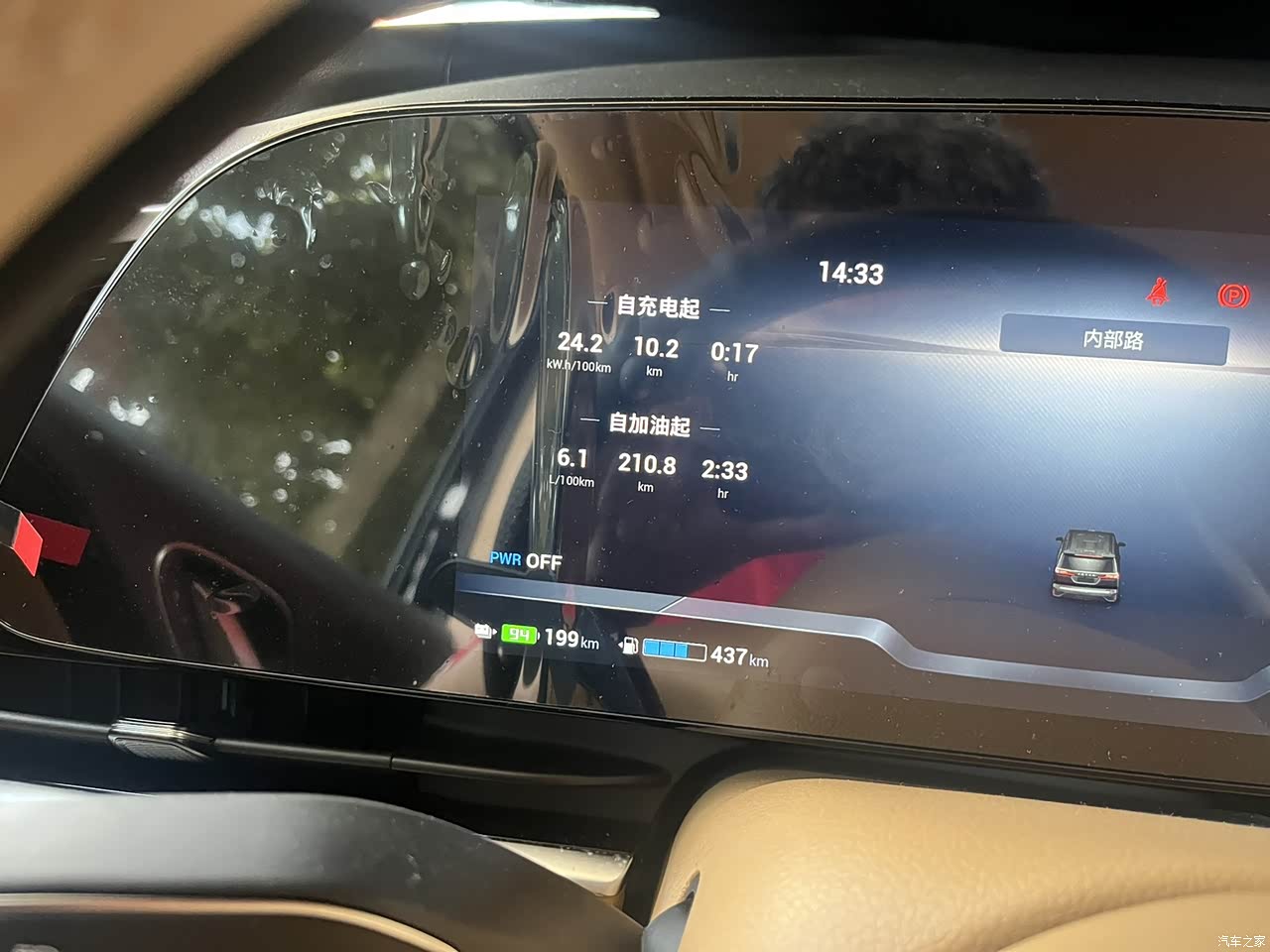续航方面,测试时间为夏天旅行,空调24.5度全车空调自动。两个方向,纯电续航大概165-190之间,市区电耗在21-23之间,市区没有用过油,能电绝对不用油,高速100吗,电耗22-24,100以内还是非常节能,而且动力非常好,120码纯电模式电耗25-27,速度过了110电耗就变高了。混动模式一般超过100的高速我才用使用,100以内的油耗为6.3.6.6油耗可以接受。120码跟电一样就变得特别大,油耗变成了7.2.-8.5。但是考虑到车子大小,可以接受。充电时间,高速快充35分钟左右可以从30-90%最后10%的充电时间比较长,最少需要15分钟。家庭充电7kw情况下,20-90%充电时间为4.5小时左右,最后10%充电需要1.5小时左右。不过考虑到日常使用90%其实就够了。邮箱不大而且需要添加95号汽油,综合续航市内练好,高速满油满电650-750公里左右,因为没有跑到趴窝,所以只有大概区间。