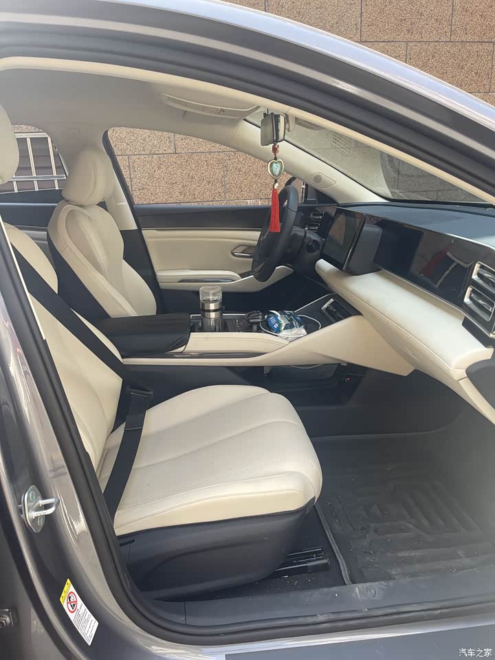 这个内饰是纯白色的,非常好看,但是也比较容易脏,需要每次经常打理的,我车后面每天放着吸尘器脏了就洗洗擦一擦。方向盘很好看,手感也不错,中控屏的话黑边有点大,显示效果还不错。