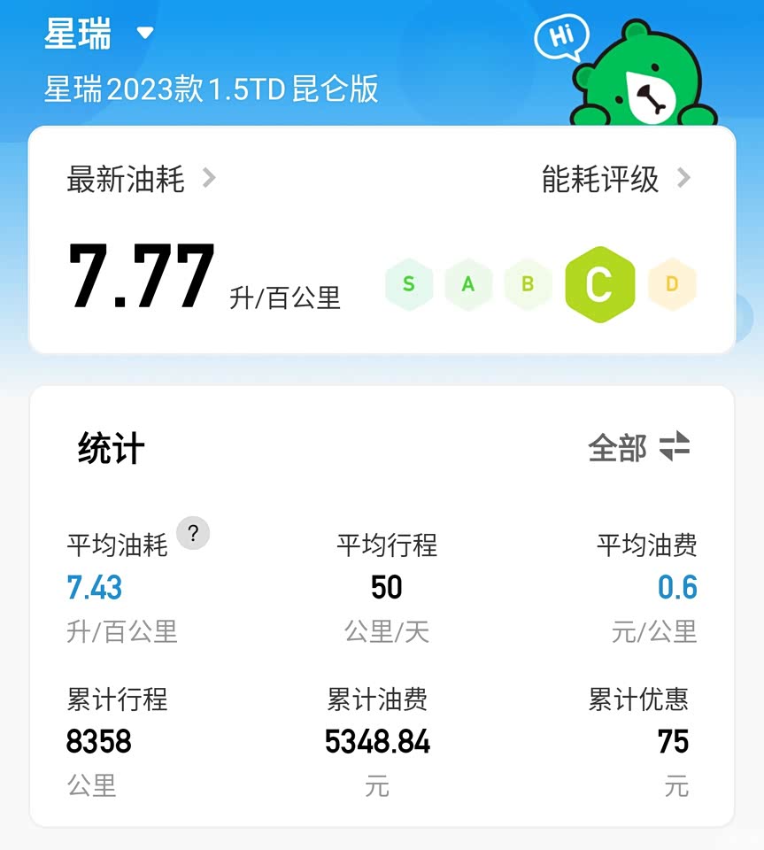 这是我至今以来的油耗记录,大概9000公里,一半高速,一半市区道路,我觉得油耗对于小轿车来说还是很不错的,而且我的车加92,我觉得这个油耗可以接受的!