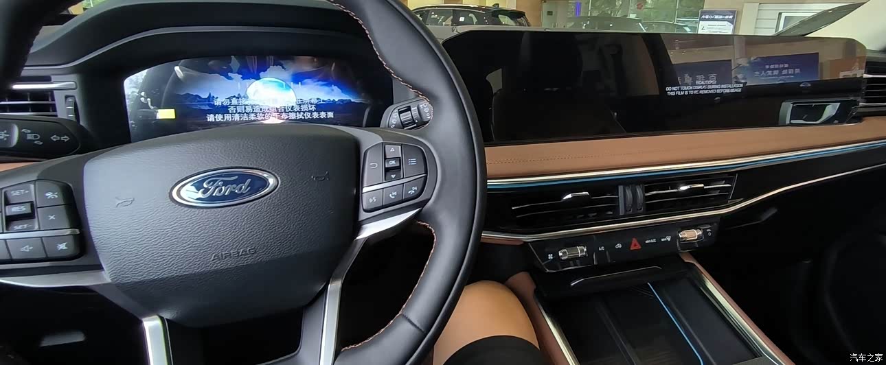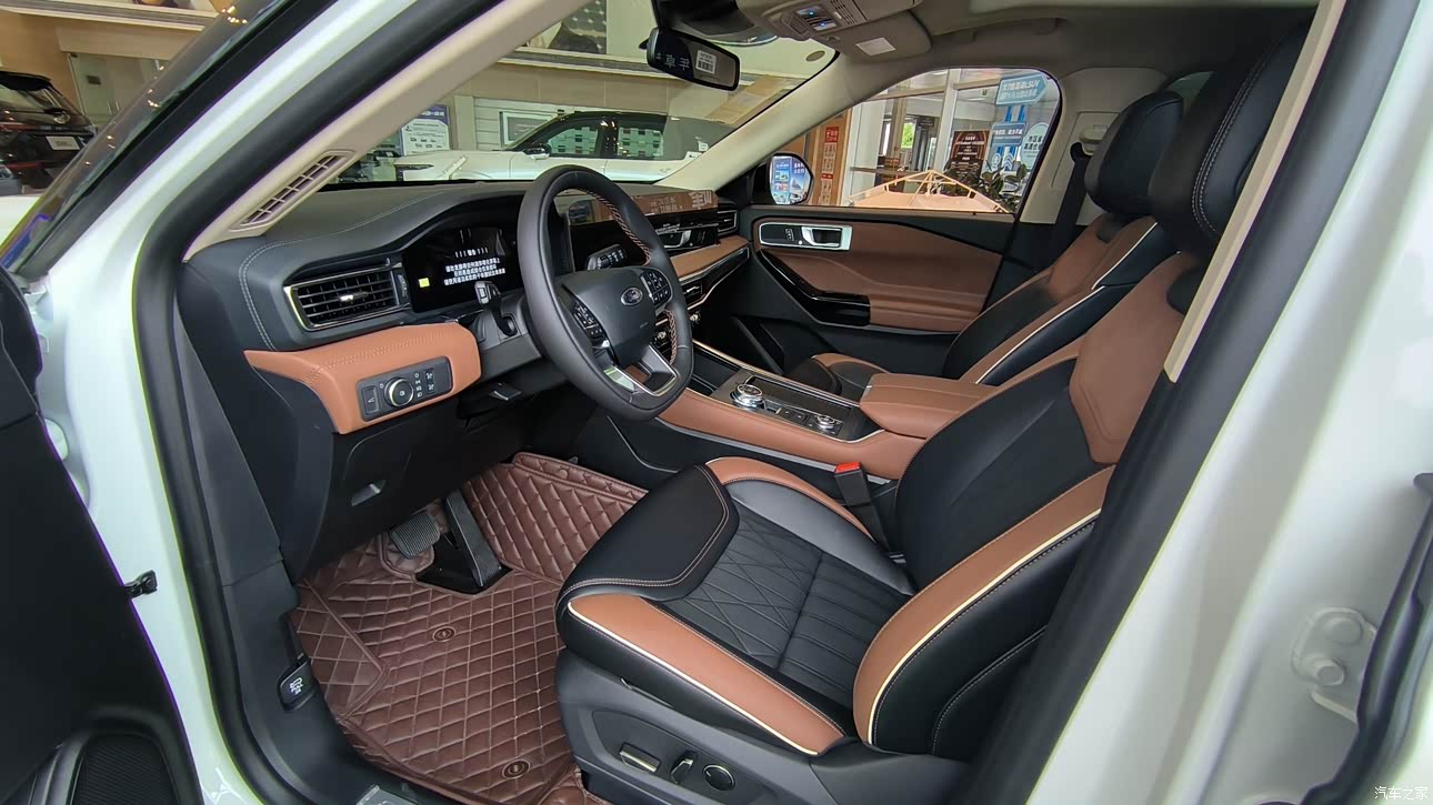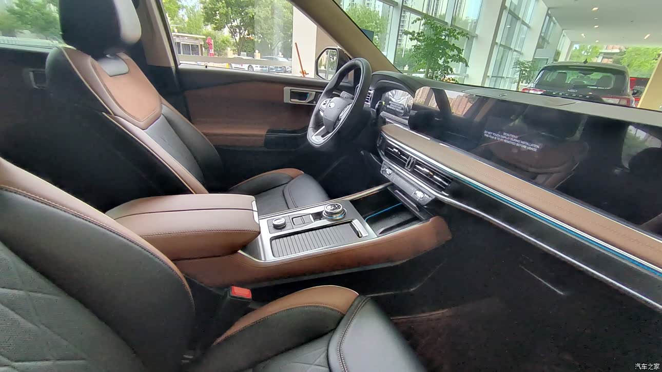 坐进车里感觉探险者内饰看起来非常干净清爽,和该车定位相符合。该车方向盘造型设计十分时尚运动,采用了真皮材质,造型简约,中控屏还是做了不小的升级,尺寸应该是27英寸的中控屏,让内饰风格给人印象深刻,显得科技感一下就起来了。仪表盘和座椅同样让人眼前一亮,该车仪表盘呈现出越野气息的设计风格,凸显了硬派的气质,全车车采用了真皮/翻毛材质混搭座椅,座椅宽大厚实,坐进去以后感觉包裹性非常好,长途开车会非常舒服。