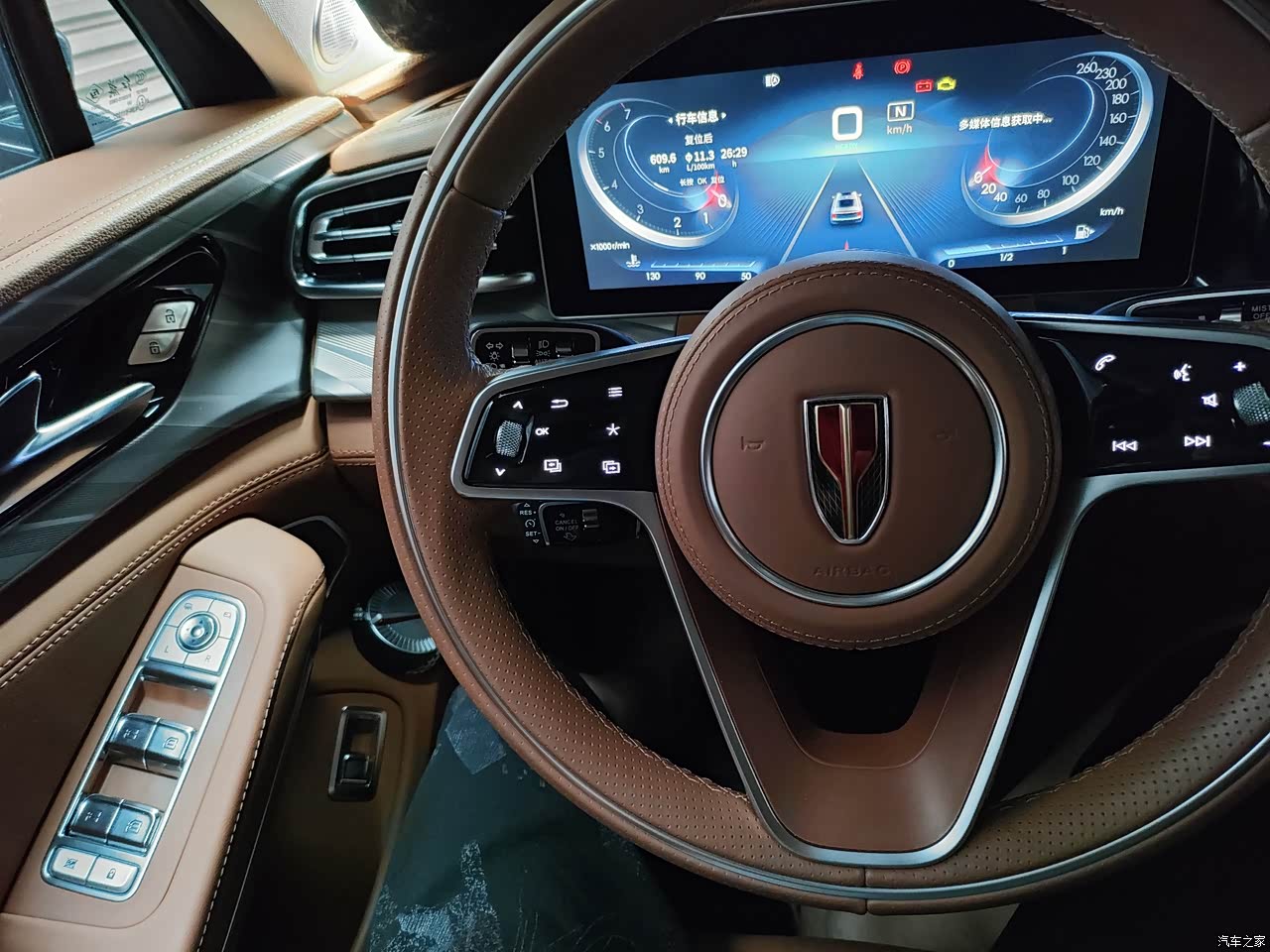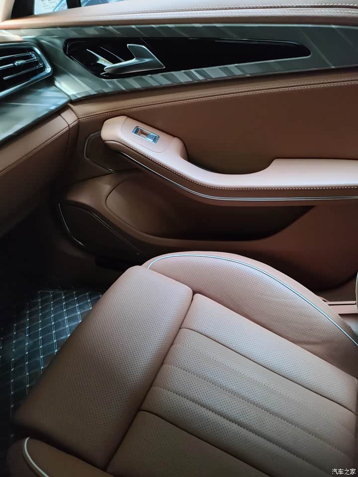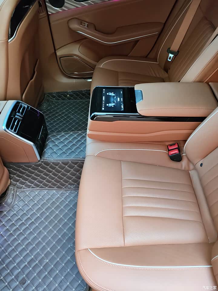 车内饰也是我喜欢的棕色,纳帕皮座椅用料算是良心用料。空调制冷效果不错,前后排独立空调,可以自由调节温度。座椅舒适型好,包裹性强,让人有一种安全感。第二排座位舒适度高,适合领导长时间乘坐。256色氛围灯可以自由调节,光线强弱可以自由控制。PM2.5过滤效果相当不错,让我能第一时间呼吸道新鲜空气。