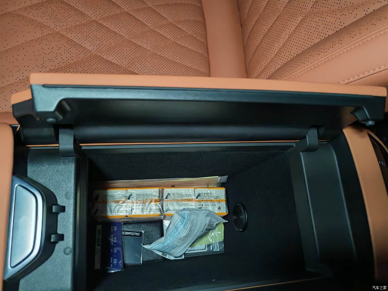 中间这个储物空间里面是掏空的,按一下就开了,能放好多小东西,纸巾,毛巾,行驶证什么的小东西我全都放里面才占这么点地方,前面的升降式茶杯孔也很棒