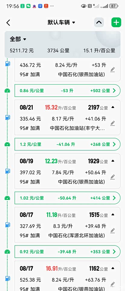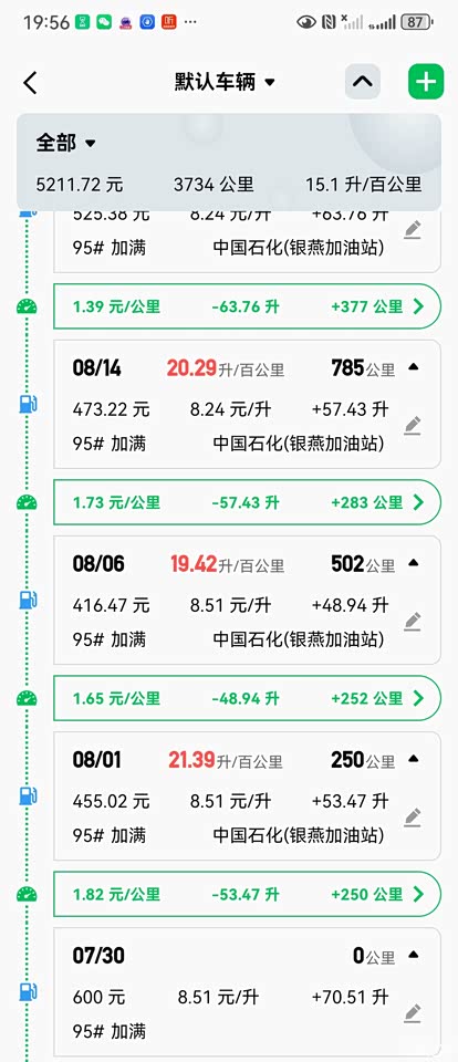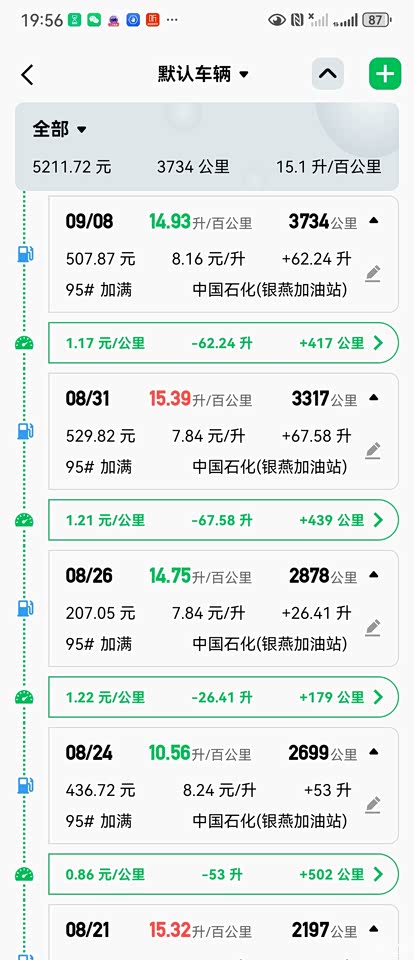 刚提车可能踩的比较猛油钱稍微高点,带孩子去一趟山西跟大滩走高速平均油耗10到12左右,定速巡航严格按照限速开的,由老婆亲自监督的,所以油耗相对比较低,日常通勤15个左右,毕竟这么大的车。想让马儿跑的快,就不能怕马儿能吃草,每次加油都有记录,大家自己看吧。