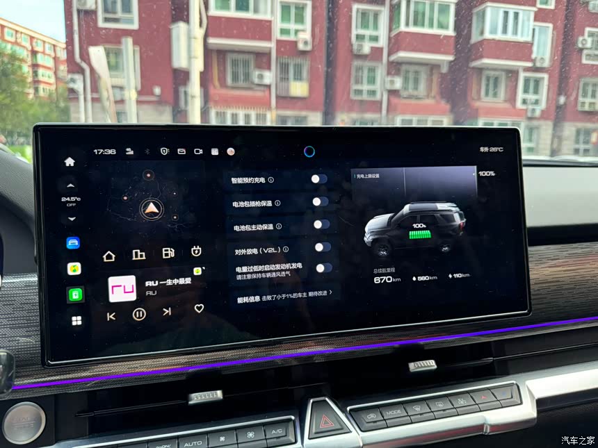 纯电模式下城市里面大概的话,充一次电是可以开个三到四天上下班是没什么问题的,然后加油的话一箱油加进去,差不多开那个智能模式的话能跑个六百多公里,700公里。 他这个充电时间比较快,从零充到满的话就45分钟,像出去远途在高速服务区的话补一点电,大概20分钟30分钟也就可以充到7,80%