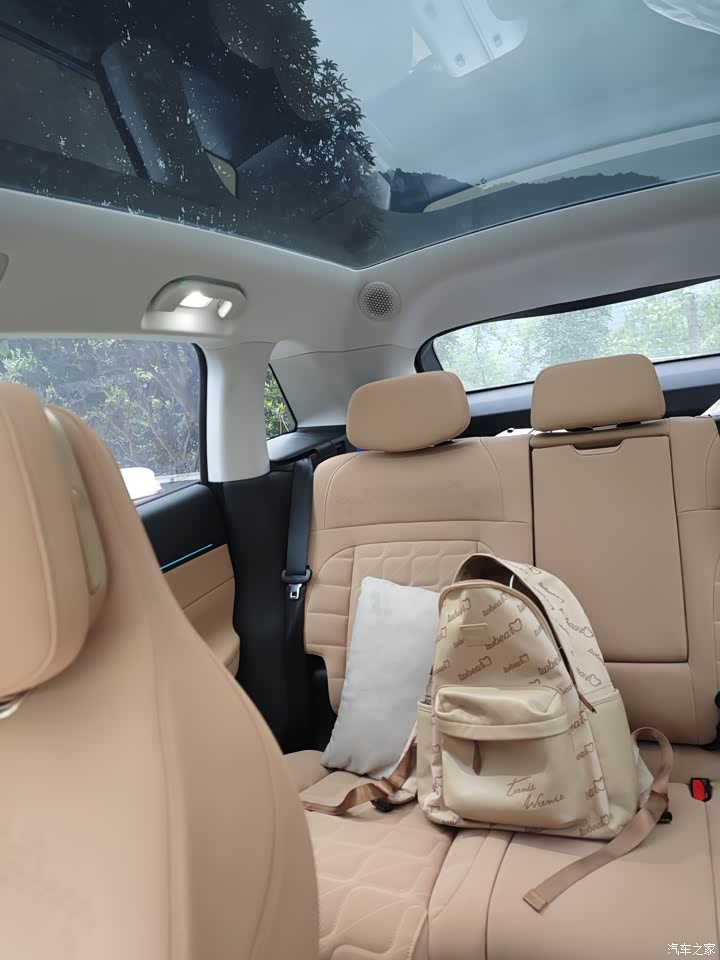 乘坐空间,后备箱是真的拉满了,非常舒服。 就是储物空间有点少,附近前面没有,头上也没有,显得不够细节。 头部空间也很足,后排坐下后头上还剩二三十公分,显得很通透。