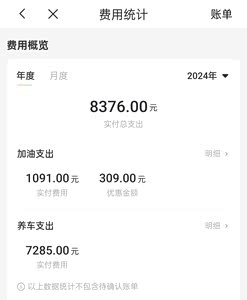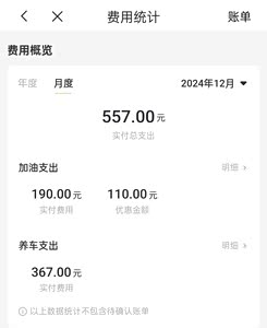 我是9月份提车的,到目前为止只花了保险四千二百八十元,还有5年双保两千元,平均一年400元。车子维修花了480元,这三个支出比较大头。 油费总共花了一千三百元,就是第一个月油耗比较高,一个月就花了五百元。第二个月没怎么出门花了两百元,第三个月车子借家人,去医院来回4次,花了两百元,还有两百元就是自己日常出行用的。这个月是十二月,我又加了两百元的油费,当前里程是1959公里,续航还有400多公里。没有特殊情况平时一个月两百元油费就够用。 平时几乎每个月洗车一次,三次总共花了50元。这是第一个月洗车三十元,后面自助洗车一次不到10元。 停车费包含社会停车和社区停车,社会停车三个月不到100元,平均每个月30元。社区停车一个月180元,不过这个月才开始收费,我用他们合作的银行卡付款还给我打八折,差不多159元一个月。 这样算下来油费➕洗车费➕停车费正常情况来说是(油费12*200=2400)➕(洗车12*10=120)➕(12*159=1908)=4428元。 一年的用车成本差不多就是4288+400+4428=9116元。今年加上额外的修车费480再加上特殊情况多出来的油费700,就是9116+480+700=10296元。 其实除了必要的支出,平时每个月油费➕洗车费➕停车费在400元左右,我的油车的用车成本也可以哦。