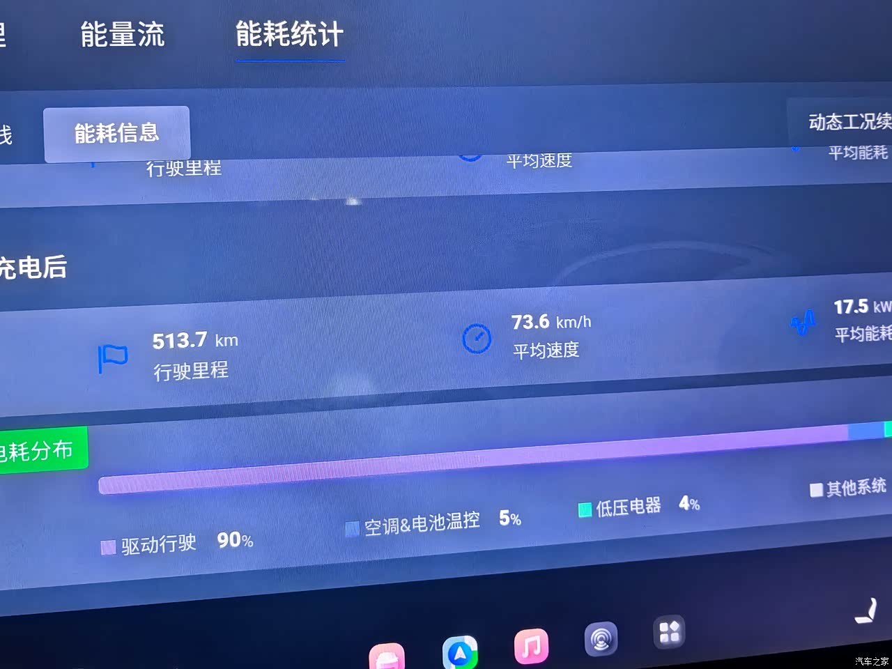 在城市里电耗多少其实是不关心的,反正充电非常方便,家里和公司都有桩补能都不浪费时间,因为什么有充满过也没跑到低于20%过,所以不知道实际续航有多少,跑了次410公里的高速,充的90%还余22%,估算应该能到600左右吧。快充试过小鹏的S4超充,峰值功率是180KW/h,国家电网的是120KW/h,快充只有跑长途才用,一年用不了几次,这个速度很满意了